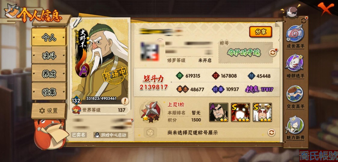【11等】戰鬥力:213W+;段位:上忍1階;本服排名:4694;戰區排名:未上榜;V