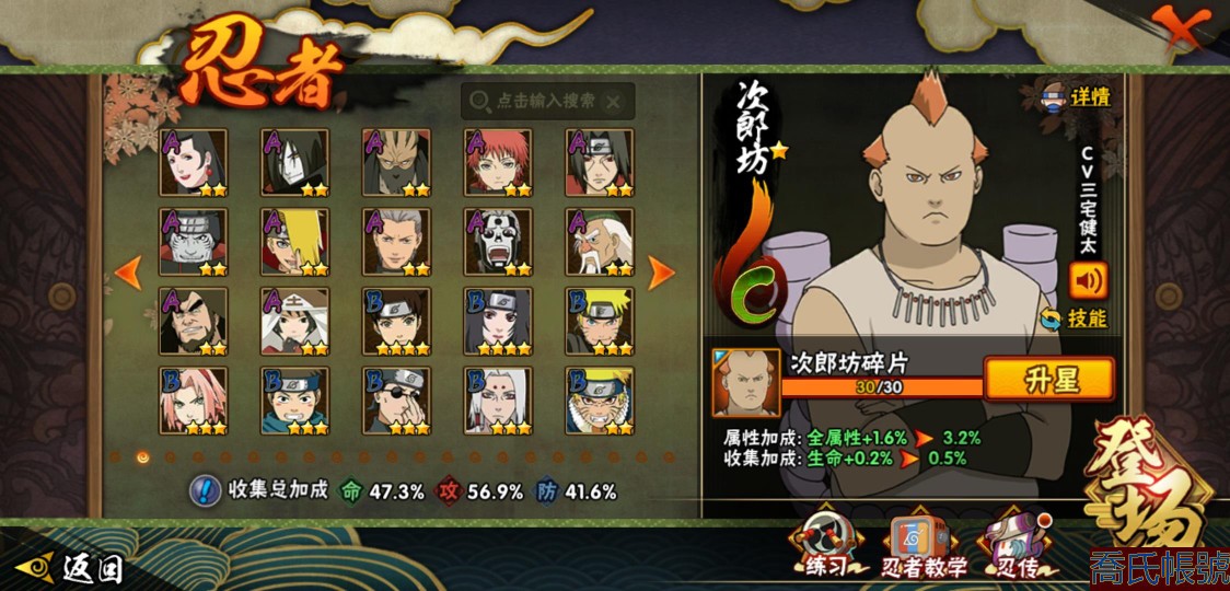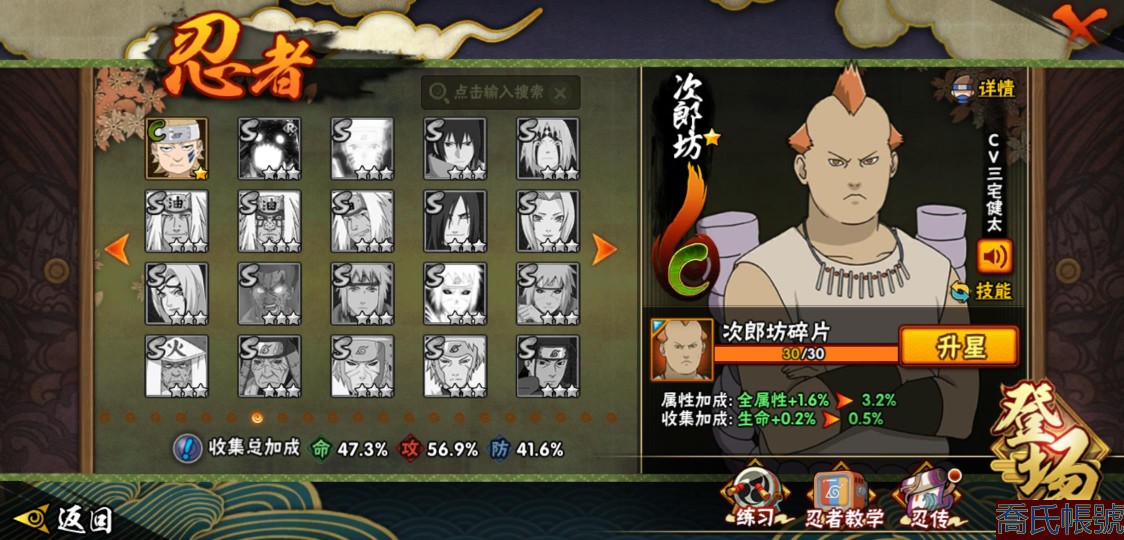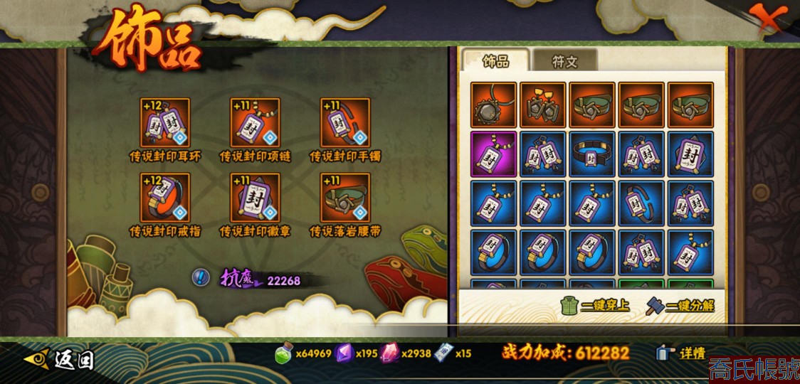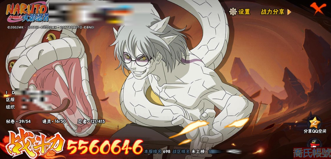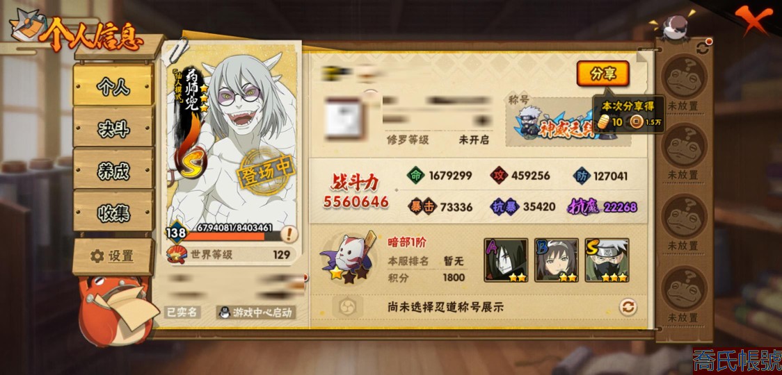 【OBHXDNK753642】戰鬥力:556W+;段位:暗部1階;本服排名:698;戰區排名:未上榜;VIP5級;S忍7個;A忍24個;通靈獸16個;S忍:須佐能乎旗木卡卡西,舞之豪傑自來也,須佐能乎宇智波鼬,白面具宇智波斑,忍界大戰宇智波帶土,天道佩恩,仙人模式藥師兜;A忍:初始形態機械鳴人,須佐能乎宇智波佐助,宇智波泉奈,忍界大戰秋道丁次,忍界大戰李洛克,邁特凱,猿飛阿斯瑪,青年波風水門,疾風傳我愛羅,穢土轉生桃地再不斬,半蛇斗篷藥師兜,不風,不緣,曉大蛇丸,緋流琥蠍,蠍,宇智波鼬,幹柿鬼鮫,迪達拉,飛段,死司憑血飛段,俠隱江湖大野木,羈絆神農,四代目土影黑土;通靈獸:忍犬,藍蛇,蛤蟆吉,砂之守鶴,忍龜,鐮鼬,猿魔,山椒魚,蜃,蛤蟆仙人,鮫鯊,蛤蟆健,烏鴉,蛤蟆龍,蛤蟆廣;時裝:百戰佩恩天道,百戰宇智波鼬須佐能乎,蜀面豪傑舞之豪傑自來也,太極靈韻日向花火武當宗師,熊貓少女天天峨眉宗師,飛瀑流泉長十郎六代目水影,烈土霓裳黑土四代目土影,緋櫻綻放春野櫻百豪;【3900】陰金水80片