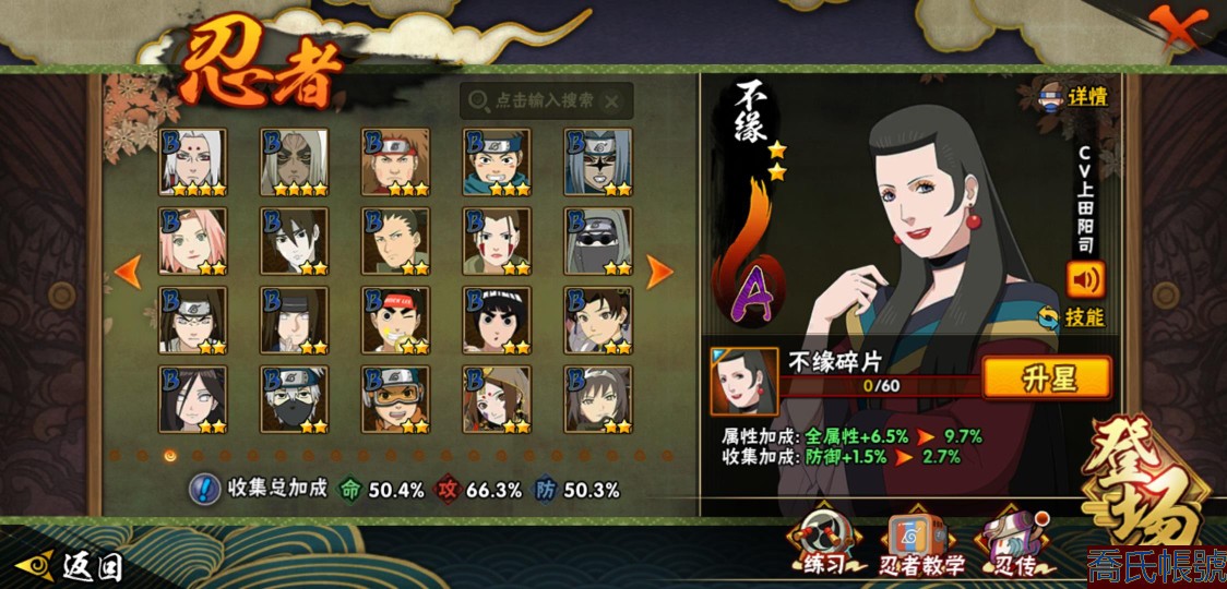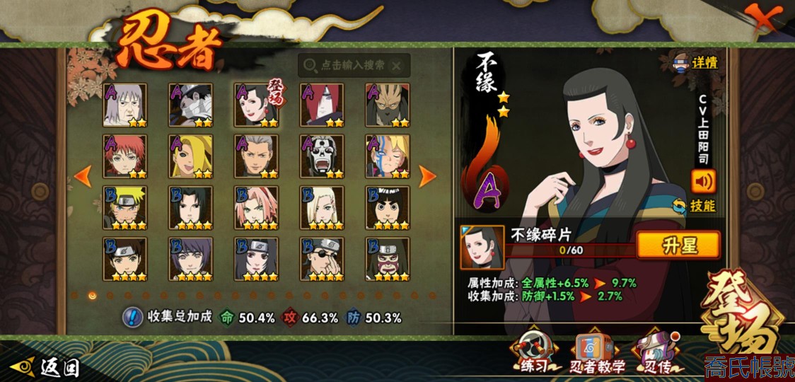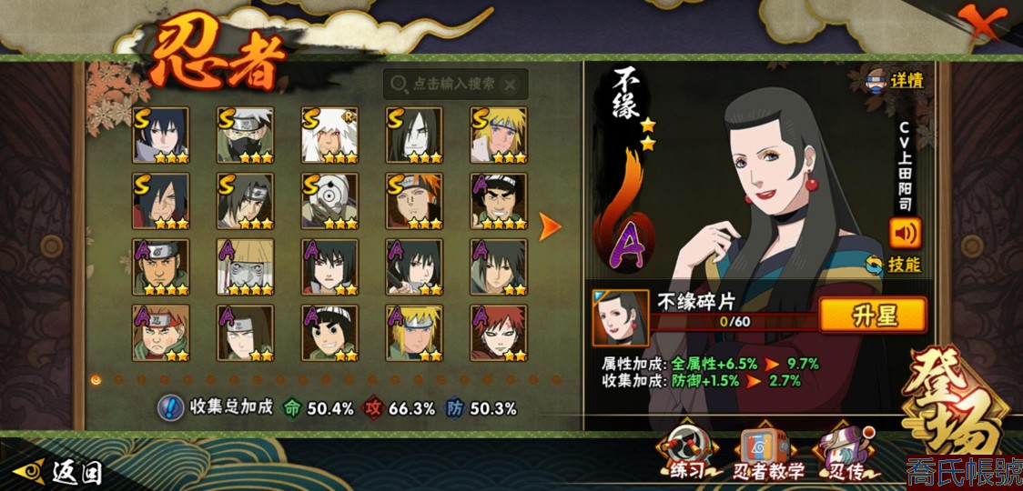 【OBHXDNK479142】戰鬥力:476W+;段位:見習3階;本服排名:;戰區排名:未上榜;VIP1級;S忍9個;A忍21個;通靈獸14個;S忍:永恆萬花筒宇智波佐助,須佐能乎旗木卡卡西,舞之豪傑自來也,大蛇丸,波風水門,穢土轉生解宇智波斑,須佐能乎宇智波鼬,白面具宇智波斑,天道佩恩;A忍:邁特凱(4星),猿飛阿斯瑪(4星),幹柿鬼鮫(4星),萬花筒寫輪眼宇智波佐助,須佐能乎宇智波佐助,宇智波泉奈,忍界大戰秋道丁次,忍界大戰日向寧次,忍界大戰李洛克,青年波風水門,疾風傳我愛羅,近松十人衛千代,穢土轉生桃地再不斬,不緣,青年長門,緋流琥蠍,蠍,穢土轉生迪達拉,飛段,死司憑血飛段,桃式顯現漩渦博人;通靈獸:忍犬,藍蛇,蛤蟆吉,忍龜,鐮鼬,猿魔,砂之守鶴,山椒魚,蜃,蛤蟆仙人,鮫鯊,蛤蟆健,烏鴉,蛤蟆龍;時裝:蜀面豪傑舞之豪傑自來也,百戰波風水門,百戰佩恩天道,百戰宇智波鼬須佐能乎,太極靈韻日向花火武當宗師,血霧怪人幹柿鬼鮫,緋櫻綻放春野櫻百豪,熊貓少女天天峨眉宗師,傳說的光芒波風水門,龍的傳人李洛克截拳宗師;【0】