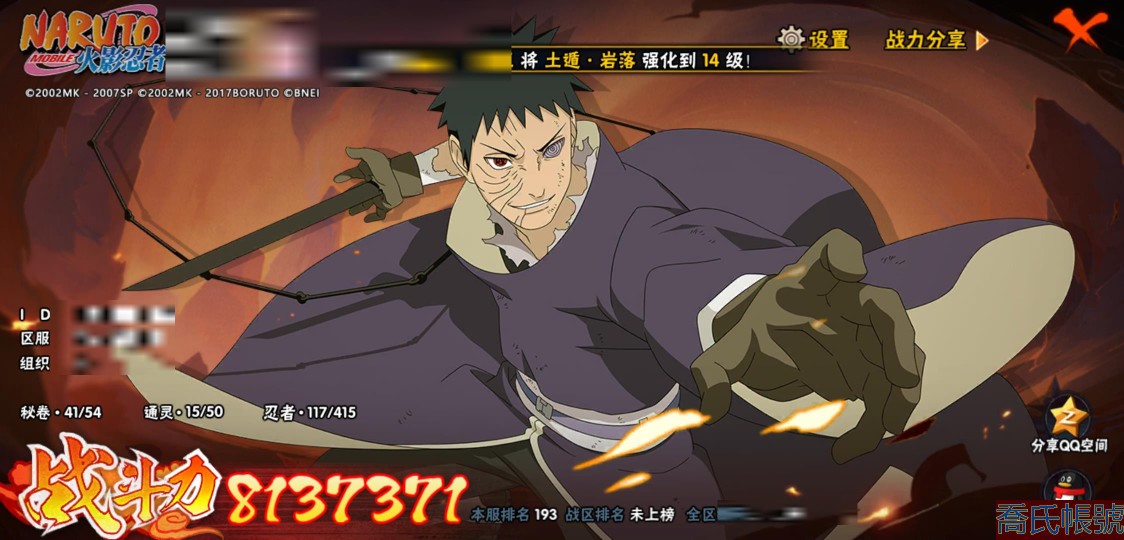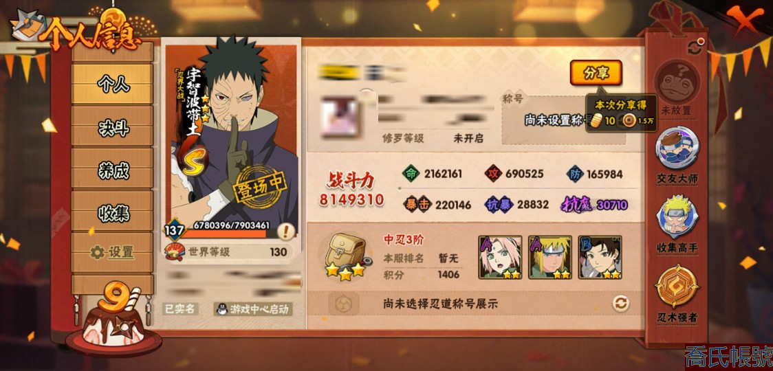 【11等】戰鬥力:814W+;段位:中忍3階;本服排名:193;戰區排名:未上榜;VI