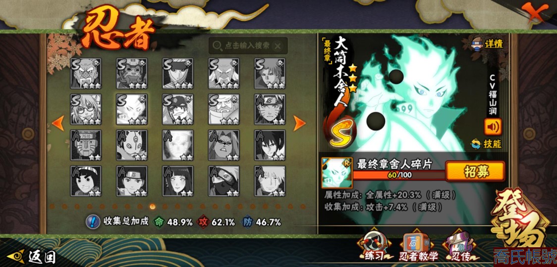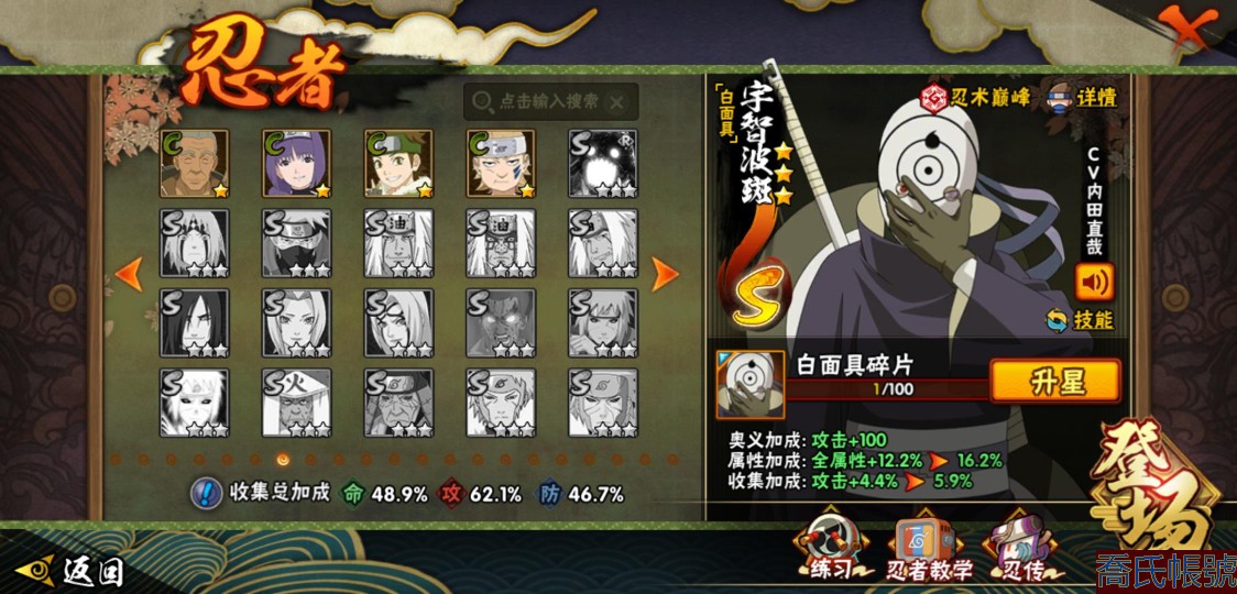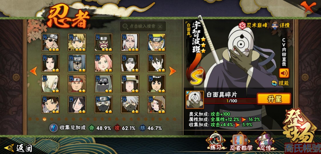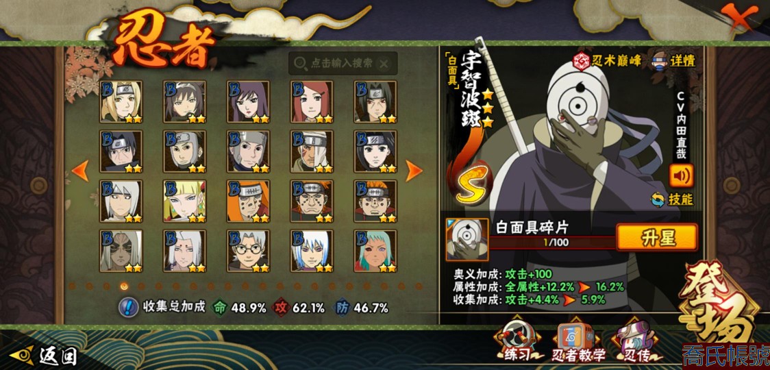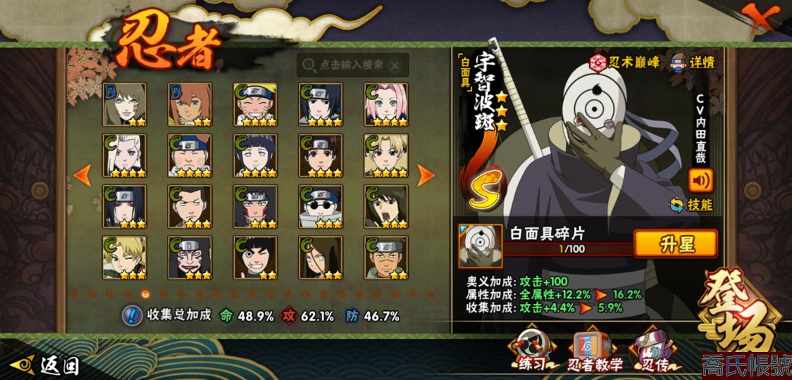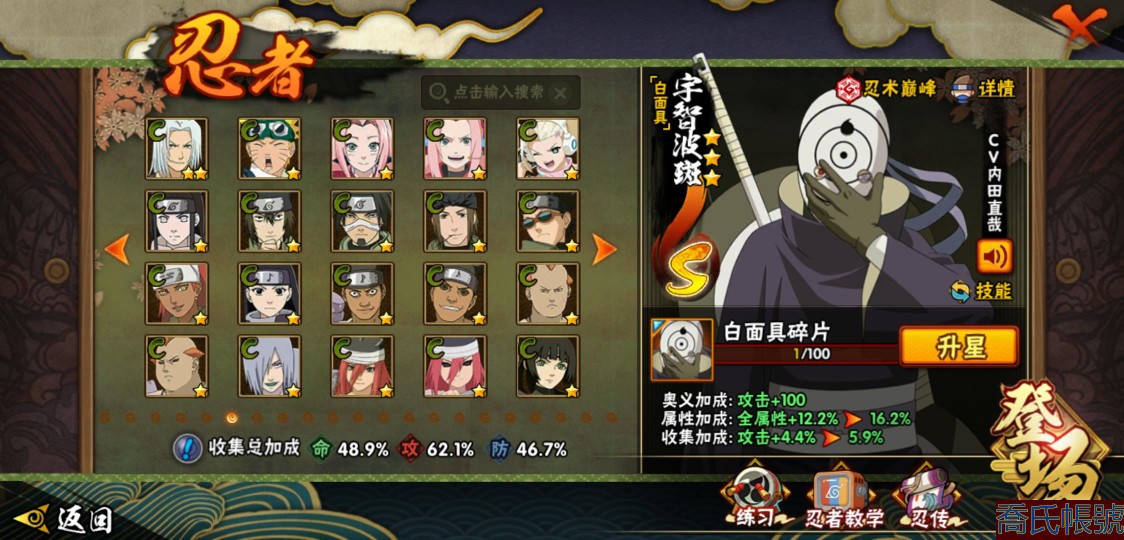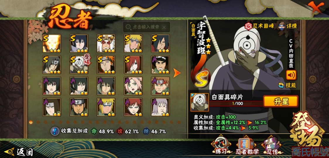 【OBHXDNK567042】戰鬥力:611W+;段位:暗部1階;本服排名:;戰區排名:;VIP級;S忍9個;A忍24個;通靈獸14個;S忍:九喇嘛連結漩渦鳴人,永恆萬花筒宇智波佐助,舞之豪傑自來也,波風水門,穢土轉生解宇智波斑,須佐能乎宇智波鼬,白面具宇智波斑,天道佩恩,穢土轉生長門;A忍:邁特凱(3星),萬花筒寫輪眼宇智波佐助,須佐能乎宇智波佐助,宇智波泉奈,百豪春野櫻,忍界大戰秋道丁次,忍界大戰日向寧次,猿飛阿斯瑪,青年波風水門,疾風傳我愛羅,近松十人衛千代,不動,青年長門,穢土轉生角都,蠍,宇智波鼬,幹柿鬼鮫,迪達拉,死司憑血飛段,俠隱江湖大野木,羈絆神農,桃式顯現漩渦博人,六代目水影長十郎,四代目土影黑土;通靈獸:忍犬,藍蛇,蛤蟆吉,砂之守鶴,忍龜,鐮鼬,猿魔,山椒魚,蜃,蛤蟆仙人,鮫鯊,蛤蟆健,烏鴉,蛤蟆龍;時裝:百戰宇智波鼬須佐能乎,百戰波風水門,百戰佩恩天道,蜀面豪傑舞之豪傑自來也,太極靈韻日向花火武當宗師,緋櫻綻放春野櫻百豪,烈土霓裳黑土四代目土影,血霧怪人幹柿鬼鮫,飛瀑流泉長十郎六代目水影,熊貓少女天天峨眉宗師;【3470】活柱間七十片