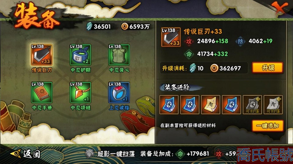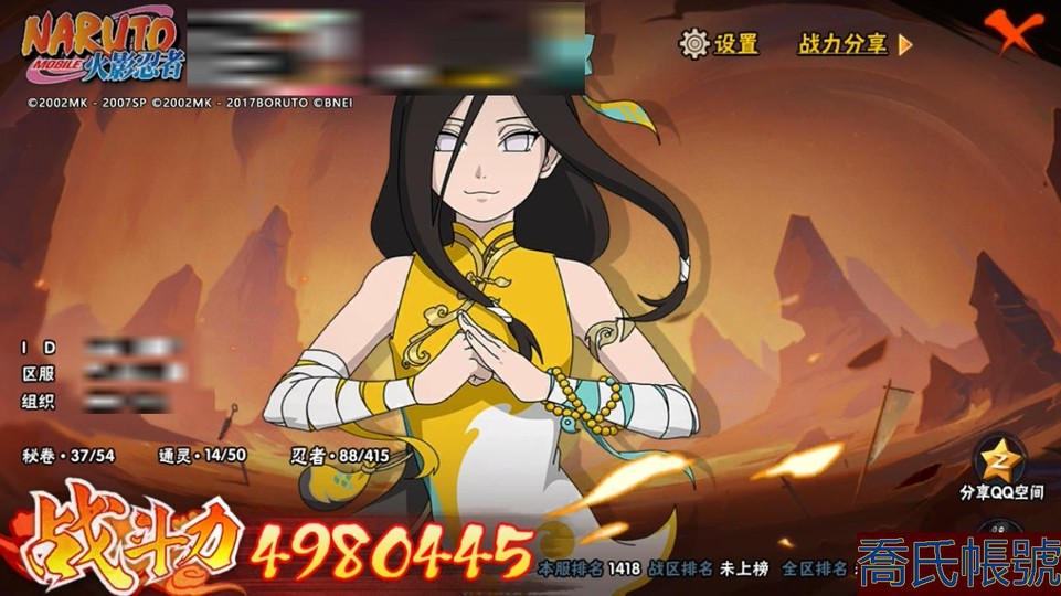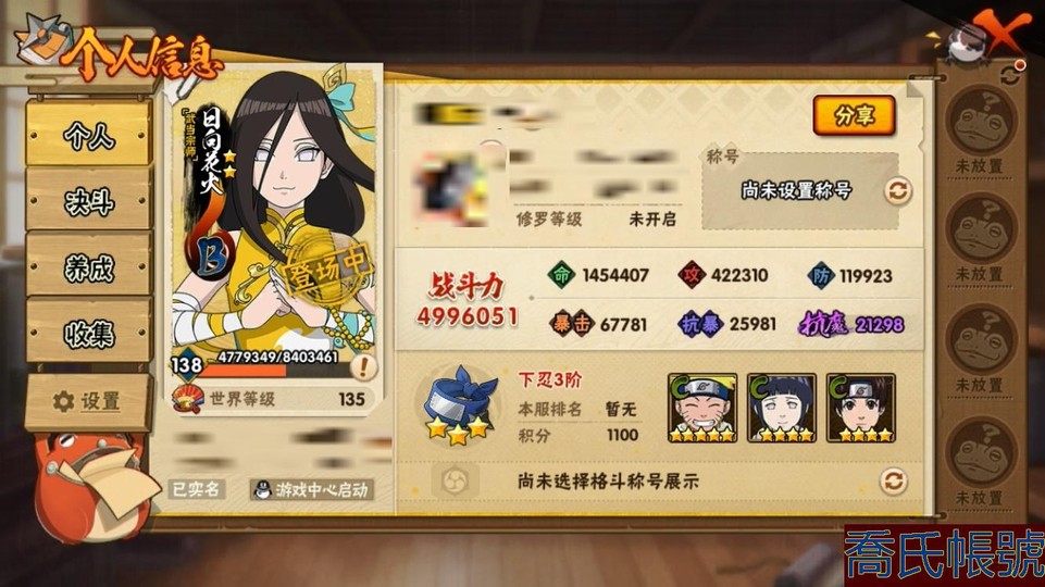 【11等】戰鬥力:499W+;段位:下忍3階;本服排名:1418;戰區排名:未上榜;V