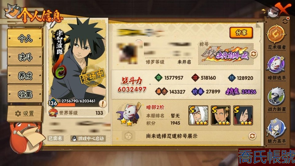 【11等】戰鬥力:603W+;段位:暗部2階;本服排名:658;戰區排名:未上榜;VI