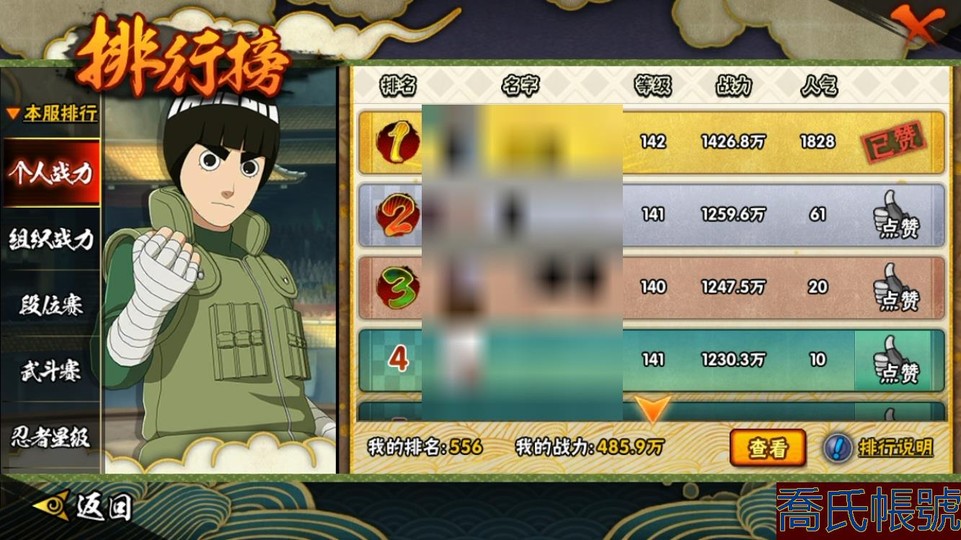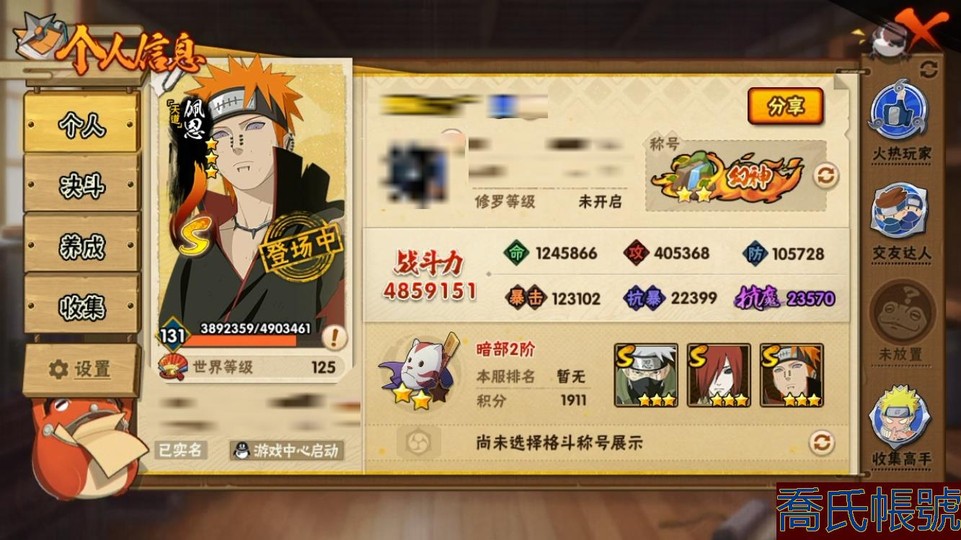 【11等】戰鬥力:485W+;段位:暗部2階;本服排名:;戰區排名:;VIP3級;S忍