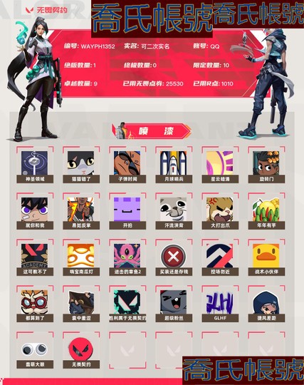 【OBWAYPH135242】Lv129|鉑金I, 刀皮數量6,槍皮數量61(絕版1限定10終極0卓越9);皮膚資產價值25530,已用R點1010;【刀皮】:近戰武器-VCT2025爪刀,近戰武器-鬼丸國綱,近戰武器-詭秘蛇影軍刀,近戰武器-神聖領域戰刀,近戰武器-日耀風暴遺器,近戰武器-阿特拉斯指揮部甩棍; 【槍皮】:標配-黯夜怪談,正義-奇點,狂徒-虛空遺器,狂徒-RGX11zPro,鬼魅-天界神兵,正義-掠影,狂徒-掠影,狂徒-日冕雄師,幻影-天界神兵2.0,幻影-異鱗魔蛇,冥駒-離子武器,冥駒-墮天遺武,冥駒-冰點凝凍,鬼魅-詭秘蛇影,駭靈-無限競技,判官-詭秘蛇影,狂徒-詭秘蛇影,莽俠-詭秘蛇影,狂徒-阿特拉斯指揮部,幻影-日耀風暴,幻影-神聖領域,獠犬-神聖領域,莽俠-阿特拉斯指揮部,正義-日耀風暴,標配-阿特拉斯指揮部,狂怒-神聖領域,駭靈-阿特拉斯指揮部,駭靈-日耀風暴,奧丁-日耀風暴,戰神-神聖領域,幻影-悠閒貓生,幻影-末日之翼,戍衛-太空穿梭,戍衛-甜蜜戰術,戍衛-折光稜晶,戍衛-月球哨兵,獠犬-悠閒貓生,獠犬-幻語魔咒,冥駒-甜蜜戰術,冥駒-星雲暗湧,莽俠-月球哨兵,飛將-悠閒貓生,飛將-幻語魔咒,飛將-末日之翼,正義-太空穿梭,正義-月球哨兵,鬼魅-甜蜜戰術,鬼魅-星雲暗湧,標配-折光稜晶,短炮-悠閒貓生,短炮-末日之翼,狂怒-幻語魔咒,駭靈-星雲暗湧,蜂刺-折光稜晶,蜂刺-星雲暗湧,判官-太空穿梭,判官-甜蜜戰術,雄鹿-幻語魔咒,雄鹿-月球哨兵,奧丁-末日之翼,戰神-太空穿梭;【熱門卡面】:情人節獵梟卡面,勢不可擋捷風卡面,勢不可擋賢者卡面,勢不可擋蝰蛇卡面,勢不可擋芮娜卡面,勢不可擋星礈卡面,VCT2025CN聯賽卡面,VCT2025太平洋聯賽卡面,VCT2025美洲聯賽卡面,VCT2025EMEA聯賽卡面,雙城之戰金克絲卡面;【熱門掛飾】:薰衣草之心掛飾,飛刀掛飾,雙城之戰魄羅掛飾,神中神掛飾,VCT2025CN聯賽掛飾,VCT2025太平洋聯賽掛飾,VCT2025EMEA聯賽掛飾,VCT2025美洲聯賽掛飾,袖珍捷風掛飾;【熱門噴漆】:捷風噴漆,捷風跳PEEK噴漆,真煩人噴漆,進擊的章魚2噴漆,買裝還是存錢噴漆,戰術小夥伴噴漆;【皮膚可能含有某些特權皮膚,具體以遊戲內實際擁有為準】異鱗幻影 奇點正義 冰點冥駒 日曜遺器 顯示卡狂徒 天界鬼魅 掠奪狂徒 詭秘軍刀 天界幻影 鬼丸國綱 虛空狂徒 掠奪正義 神聖戰刀 黯夜標配 vct爪刀 日冕狂徒 離子冥駒 庫存:25530 剩餘VP:96剩餘R點:860段位:黃金3