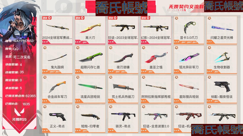 【OBWAYPH765342】Lv309|黃金III, 刀皮數量15,槍皮數量126(絕版4限定35終極0卓越5);皮膚資產價值62365,已用R點1635;【刀皮】:近戰武器-2024全球冠軍賽戰刀,近戰武器-離火刃,近戰武器-顯示卡3.0爪刀,近戰武器-閃耀之星熒光棒,近戰武器-鬼丸國綱,近戰武器-超限快閃記憶體匕首,近戰武器-夜刃詭鐮,近戰武器-蓋亞之慍,近戰武器-弧光異彩軍刀,近戰武器-生物收割器,近戰武器-合金戰車軍刀,近戰武器-流星兵團短劍,近戰武器-荒土機兵熱能刀,近戰武器-阿特拉斯指揮部甩棍,近戰武器-星際獵兵短劍; 【槍皮】:狂徒-2023全球冠軍賽,幻影-2024全球冠軍賽,標配-黯夜怪談,正義-奇點,短炮-歸零者,駭靈-奇點,狂徒-全息波普2.0,狂徒-機動狂飆,狂徒-光明哨兵,狂徒-歸零者,狂徒-混沌序曲,幻影-砰砰X特攻隊,幻影-黯夜怪談,戍衛-破敗軍械,獠犬-黯夜怪談,獠犬-歸零者,冥駒-歸零者,飛將-黯夜怪談,莽俠-顯示卡3.0,戰神-奇點,鬼魅-蓋亞的復仇,狂徒-蓋亞的復仇,狂徒-紫闕金琅,幻影-偵察力量,標配-星際獵兵,鬼魅-詭秘蛇影,正義-復古浪潮,正義-合金戰車,短炮-弧光異彩,駭靈-流星兵團,蜂刺-合金戰車,蜂刺-弧光異彩,判官-星際獵兵,狂徒-弧光異彩,幻影-星際獵兵,幻影-合金戰車,幻影-噬源獸防衛工程,獠犬-弧光異彩,飛將-星際獵兵,飛將-合金戰車,標配-彩夢之城,標配-超能衝撞,鬼魅-數碼咒術,鬼魅-信手塗鴉,狂怒-花漾粉紅,駭靈-花漾粉紅,駭靈-信手塗鴉,判官-數碼咒術,雄鹿-彩夢之城,戍衛-彩夢之城,戍衛-花漾粉紅,獠犬-數碼咒術,冥駒-花漾粉紅,飛將-信手塗鴉,奧丁-信手塗鴉,戰神-數碼咒術,鬼魅-無畏契約go第一卷,狂徒-阿特拉斯指揮部,狂徒-荒土機兵,狂徒-超能偶像,狂徒-流星兵團,幻影-超限快閃記憶體,戍衛-超能偶像,冥駒-荒土機兵,莽俠-阿特拉斯指揮部,莽俠-超限快閃記憶體,正義-日耀風暴,正義-超限快閃記憶體,鬼魅-流星兵團,標配-阿特拉斯指揮部,標配-荒土機兵,標配-超能偶像,駭靈-阿特拉斯指揮部,駭靈-荒土機兵,蜂刺-超限快閃記憶體,判官-超能偶像,奧丁-流星兵團,狂徒-瑰夢藝語,幻影-悠閒貓生,幻影-奈米打擊,幻影-聚合之力,戍衛-光環序列,戍衛-太空穿梭,戍衛-逆衝蠻牛,戍衛-浮光躍金,戍衛-戰術熊與夥伴們,獠犬-悠閒貓生,獠犬-逆衝蠻牛,獠犬-模擬赫茲,獠犬-採蜜小蜂隊,冥駒-光環序列,冥駒-模擬赫茲,莽俠-纖雲弄巧,飛將-悠閒貓生,飛將-聚合之力,飛將-戰術熊與夥伴們,正義-太空穿梭,正義-奈米打擊,正義-纖雲弄巧,鬼魅-瑰夢藝語,鬼魅-星雲暗湧,鬼魅-模擬赫茲,鬼魅-採蜜小蜂隊,標配-浮光躍金,標配-戰術熊與夥伴們,短炮-悠閒貓生,短炮-纖雲弄巧,狂怒-光環序列,狂怒-逆衝蠻牛,狂怒-聚合之力,狂怒-戰術熊與夥伴們,駭靈-瑰夢藝語,駭靈-浮光躍金,蜂刺-聚合之力,蜂刺-纖雲弄巧,判官-太空穿梭,判官-奈米打擊,判官-採蜜小蜂隊,雄鹿-瑰夢藝語,雄鹿-逆衝蠻牛,雄鹿-模擬赫茲,奧丁-奈米打擊,戰神-光環序列,戰神-太空穿梭,戰神-浮光躍金,戰神-採蜜小蜂隊;【熱門卡面】:萬聖夜卡面,雙城之戰金克絲卡面,狼人獵手卡面,分崩離析卡面,雙城之戰姐妹卡面,雙城之戰擁抱卡面,VCTCN首冠卡面,2024全球冠軍賽卡面,超能偶像卡面,離火刃凰卡面,離火刃鳳卡面,勢不可擋零卡面;【熱門掛飾】:古代傳承掛飾,薰衣草之心掛飾,神中神掛飾,雙城之戰小蛋糕掛飾,終章KO小金人掛飾,糖葫蘆掛飾,袖珍捷風掛飾,2024全球冠軍賽掛飾,超能偶像掛飾,迷你機甲掛飾,雲開見日掛飾,紫菜包飯掛飾,傳世蓮華掛飾,數碼咒術掛飾;【熱門噴漆】:蹦蹦小兔噴漆,調大音量噴漆,無條件投降噴漆,鞠躬噴漆,布魯諾的快樂舞噴漆,鼻尖上的蝴蝶噴漆,皮蛋呼呼噴漆,小丑貓噴漆,2024全球冠軍賽噴漆,超能偶像噴漆,開心到爆炸噴漆,皮蛋萌舞噴漆,這就太不行了噴漆,別擋我的路噴漆,這可不太行噴漆,買裝還是存錢噴漆,雙擊點贊噴漆,繼續搖滾噴漆,擼到禿噴漆,看穿一切噴漆,蓋可差距噴漆,目瞪口呆噴漆,紙箱小貓噴漆,自我否定噴漆,沒有資金噴漆;【皮膚可能含有某些特權皮膚,具體以遊戲內實際擁有為準】買賣,買的時候比這貴兄弟,可砍