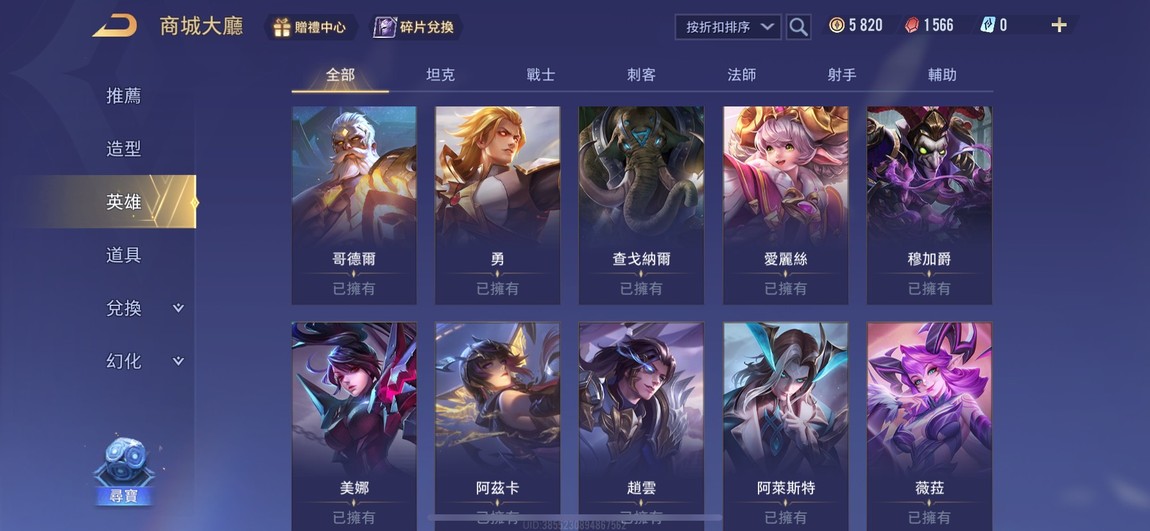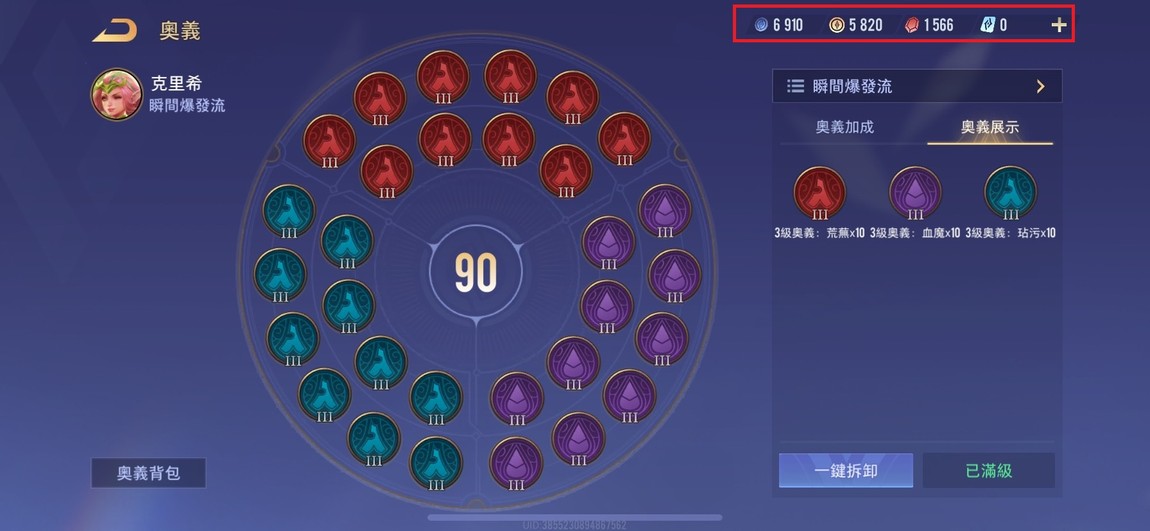 金幣:5820 、寶石:1566 、奧義碎片:6910。