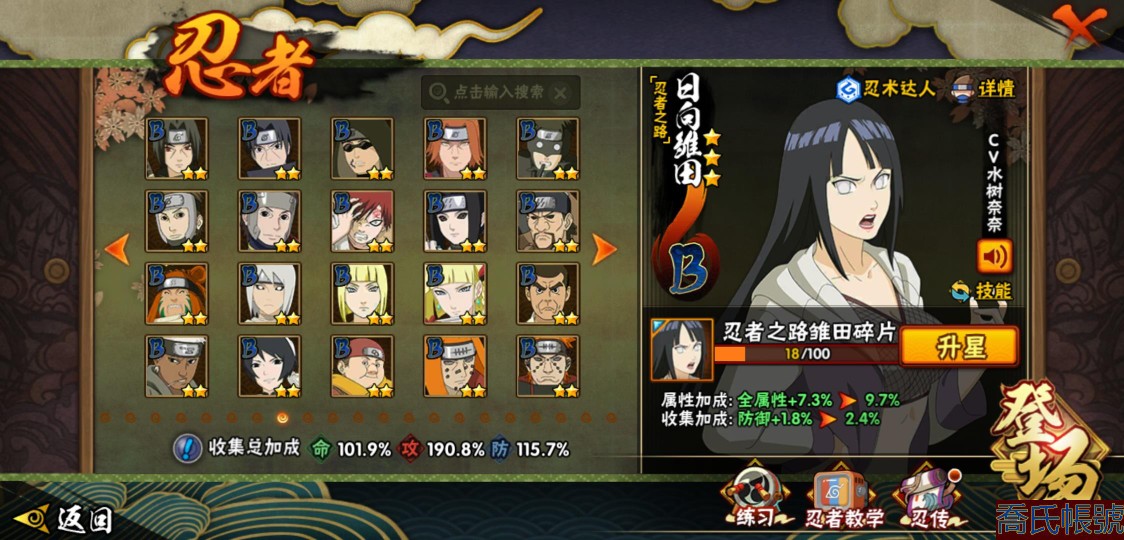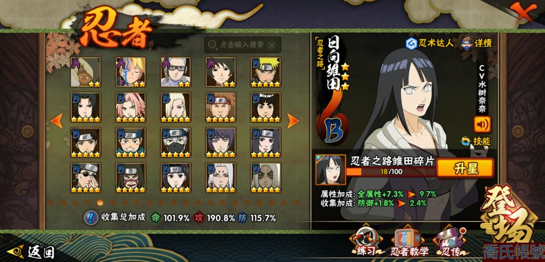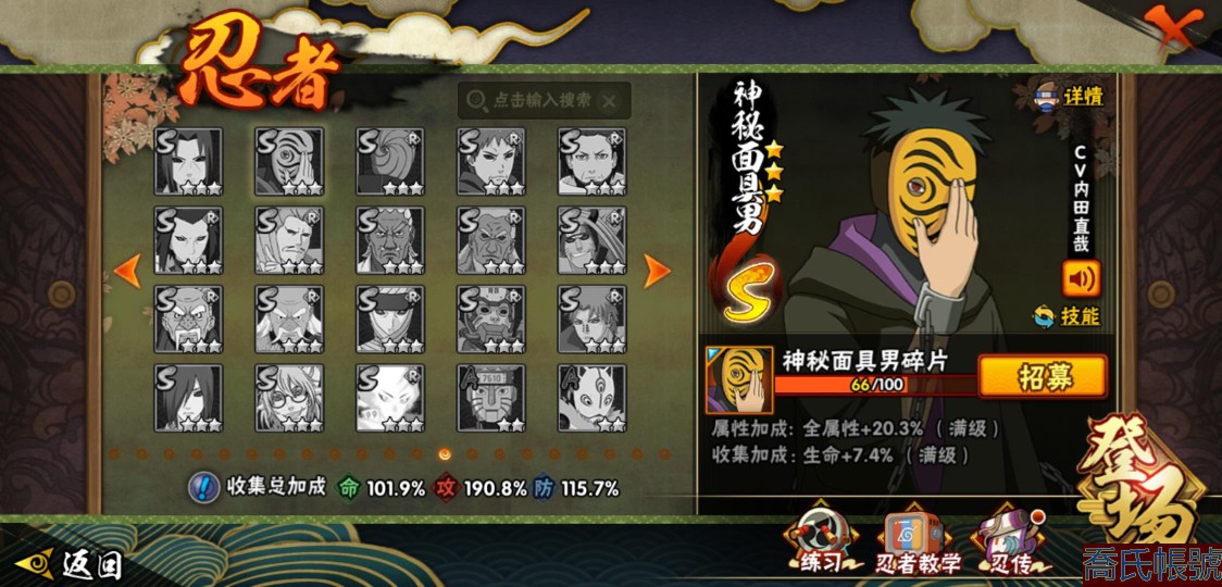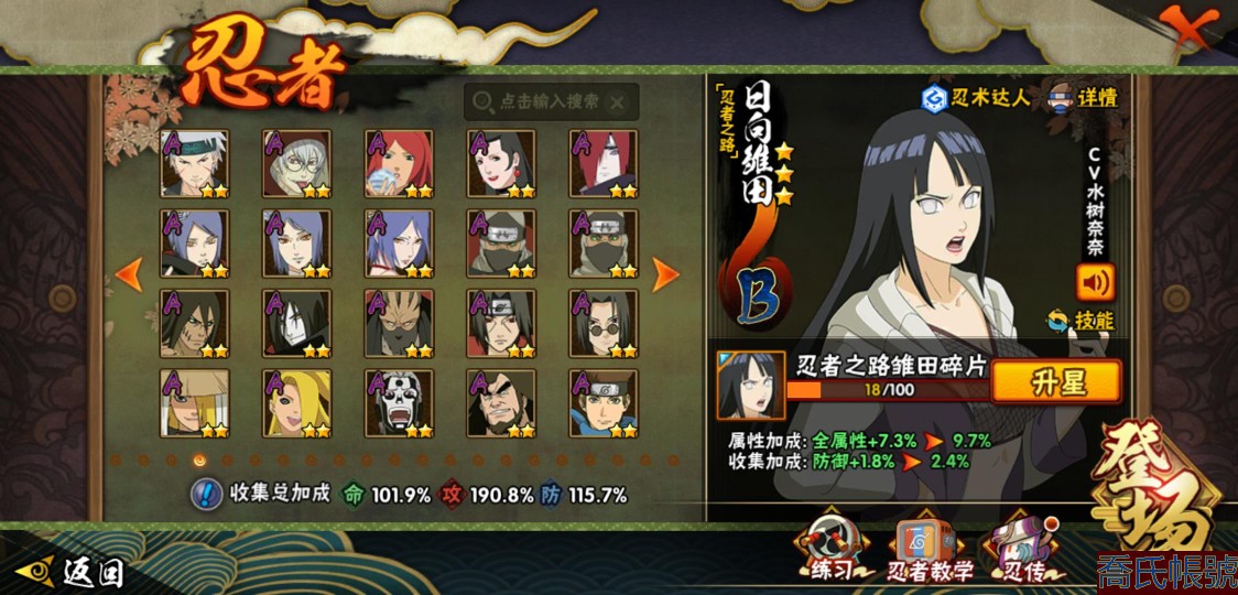 【OBHXDNK206742】戰鬥力:1351W+;段位:中忍3階;本服排名:346;戰區排名:未上榜;VIP11級;S忍31個;A忍53個;通靈獸20個;S忍:大蛇丸(4星),須佐能乎宇智波鼬(4星),暴怒第六尾漩渦鳴人,九喇嘛連結漩渦鳴人,永恆萬花筒宇智波佐助,忍界大戰春野櫻,須佐能乎旗木卡卡西,自來也,舞之豪傑自來也,綱手,百豪綱手,死門邁特凱,波風水門,穢土轉生波風水門,穢土轉生猿飛日斬,穢土轉生千手扉間,千手扉間,穢土轉生千手柱間,木葉創立千手柱間,穢土轉生宇智波斑,宇智波斑,木葉創立宇智波斑,穢土轉生解宇智波斑,須佐能乎宇智波止水,白面具宇智波斑,忍界大戰宇智波帶土,紅夜之刃神秘面具男,忍界大戰艾,天道佩恩,大筒木桃式,大筒木金式;A忍:邁特凱(5星),猿飛阿斯瑪(5星),幹柿鬼鮫(5星),疾風傳我愛羅(4星),蠍(4星),飛段(3星),仙人模式漩渦鳴人,九尾查克拉漩渦鳴人,萬花筒寫輪眼宇智波佐助,須佐能乎宇智波佐助,宇智波泉奈,百豪春野櫻,忍界大戰秋道丁次,忍界大戰日向寧次,忍界大戰李洛克,最終章日向雛田,幻之真容旗木卡卡西,萬花筒寫輪眼旗木卡卡西,宇智波止水,青年波風水門,忍界大戰我愛羅,近松十人衛千代,俠隱江湖照美冥,五代目水影照美冥,桃地再不斬,穢土轉生桃地再不斬,忍界大戰奇拉比,奇拉比,青年艾,漂泊武士千手扉間,半蛇斗篷藥師兜,不風,不緣,青年長門,小南,夏日泳裝小南,漂泊浪客小南,角都,地怨虞角都,穢土轉生角都,曉大蛇丸,緋流琥蠍,宇智波鼬,新春限定宇智波鼬,迪達拉,穢土轉生迪達拉,死司憑血飛段,羈絆神農,猿飛木葉丸,五代目雷影達魯伊,桃式顯現漩渦博人,六代目水影長十郎,四代目土影黑土;通靈獸:忍犬,藍蛇,蛤蟆吉,忍龜,鐮鼬,猿魔,山椒魚,蜃,蛞蝓,蛤蟆仙人,鮫鯊,蛤蟆健,烏鴉,砂之守鶴,蛤蟆龍,蛤蟆廣,夢貘,熊貓,辛牙,鷹;時裝:百戰大蛇丸,百戰宇智波鼬須佐能乎,百戰波風水門,百戰佩恩天道,蜀面豪傑舞之豪傑自來也,太極靈韻日向花火武當宗師,龍的傳人李洛克截拳宗師,緋櫻綻放春野櫻百豪,剎那的藝術迪達拉,可愛睡衣漩渦鳴人,傳說的光芒波風水門,風之守護我愛羅忍界大戰,血霧怪人幹柿鬼鮫,熊貓少女天天峨眉宗師,紅月映雪宇智波鼬新春限定;【152】