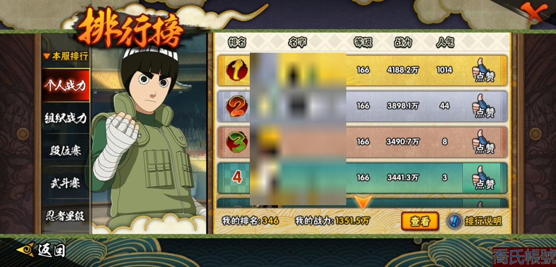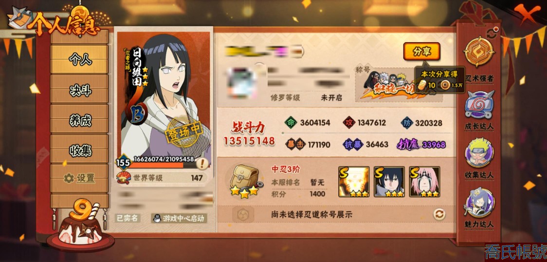 【11等】戰鬥力:1351W+;段位:中忍3階;本服排名:346;戰區排名:未上榜;V