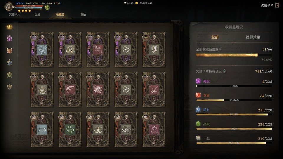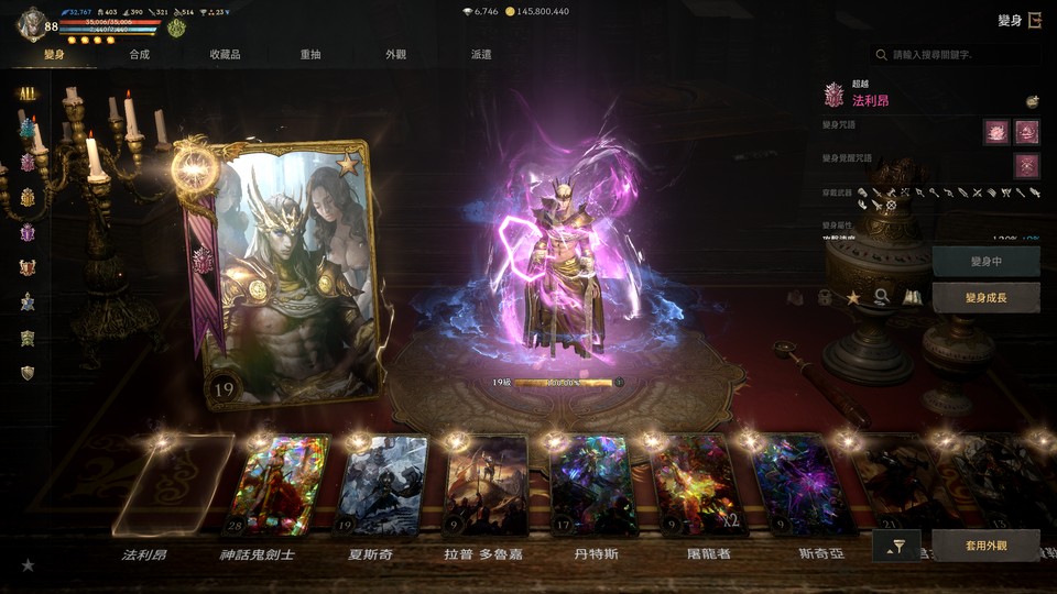變身:1粉(法利昂19級)3金17紫,收集卡片73.19%、完成收藏品44.44%。