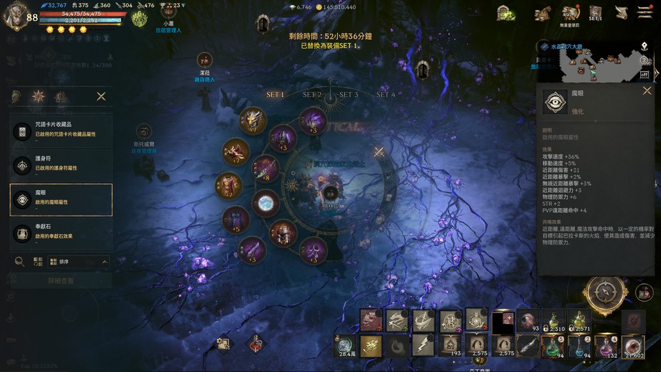魔眼:24分火眼。(攻速+36%、移速+5%、近傷+21、近暴+2%、無視近暴+3%、近迴+3、物防+6、STR+2、pvp遠命+4)