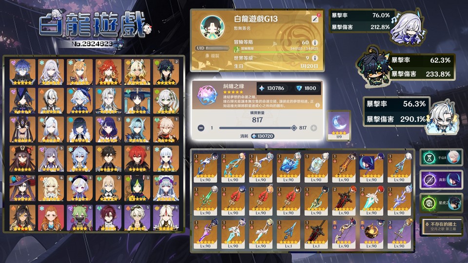 【女、60等、52金角、24金武】G13_多抽數13萬原石_絲柯克0+1基尼奇2+1雷神3+1菲林斯愛可菲火神那維