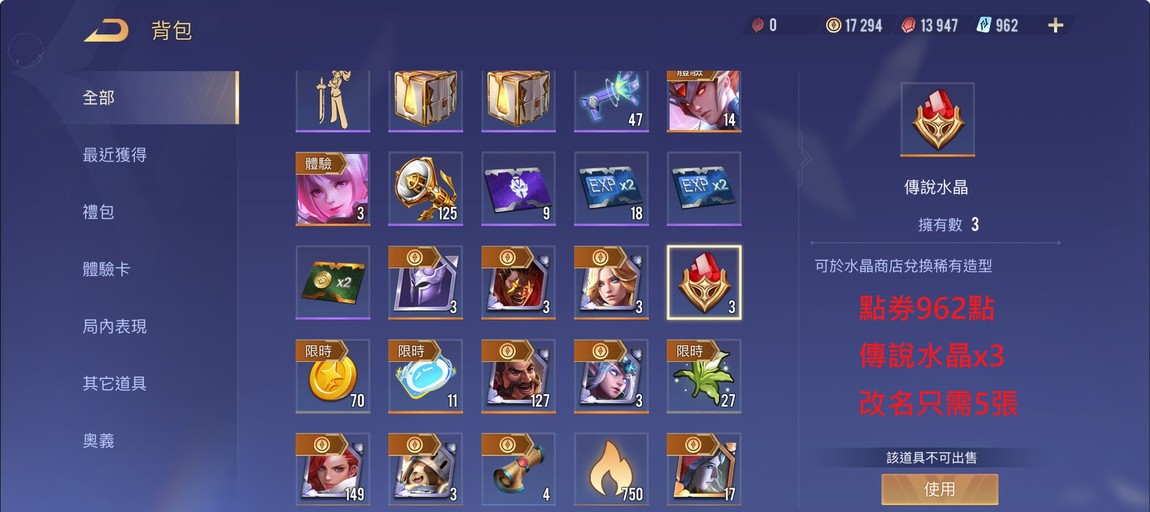 📌四三冠王、改名卡x9、點券962、傳說水晶x3