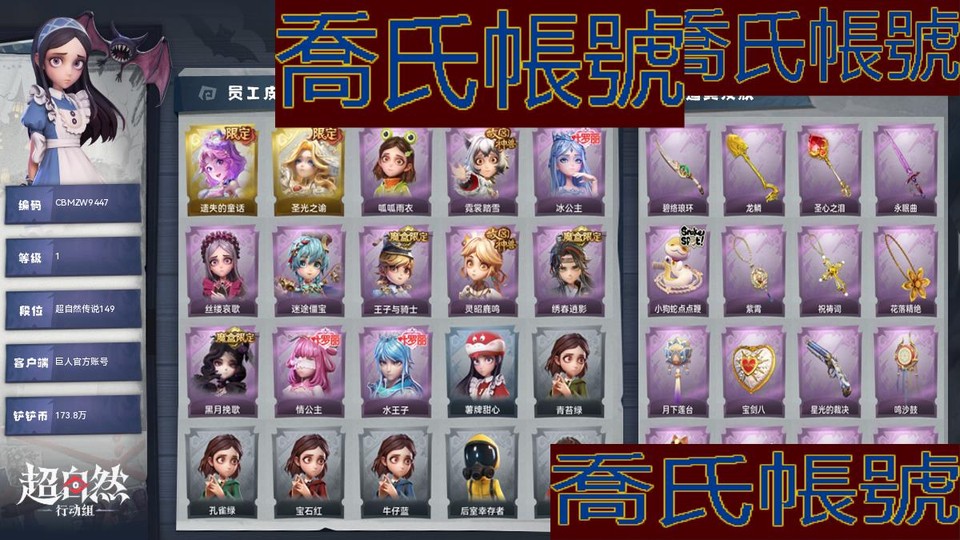 【OBCBMZW944742】金皮2;紫皮11;道具16;累充1020元;金磚2;鏟鏟幣173.8萬;皮膚:小黃-遺失的童話,薇薇安-聖光之諭,小黃-呱呱雨衣,小黃-霓裳踏雪,愛麗絲-冰公主,愛麗絲-絲縷哀歌,阿念-迷途僵寶,阿念-王子與騎士,阿念-靈昭鹿鳴,逍遙-繡春逍影,薇薇安-黑月輓歌,莉莉-情公主,艾倫-水王子;道具:刺刀-碧絡琅環,鏟子-龍鱗,鏟子-聖心之淚,桃木劍-永眠曲,長鞭-小狗蛇點點鞭,摸金符-紫霄,摸金符-祝禱詞,摸金符-花落精絕,腰包-月下蓮臺,腰包-寶劍八,短管獵槍-星光的裁決,音響-鳴沙鼓,音響-happy貓,噴氣揹包-乘風溯雪,轉輪手槍-新星時代,急救包-薔薇物語;飾品:頭飾-大蔥明頭套,頭飾-火爆了頭套,頭飾-炙熱燒烤,頭飾-駝半仙頭套,頭飾-龍傲天頭套,頭飾-魚頭怪頭套,頭飾-烈焰紅唇頭套,頭飾-面具馬頭套,頭飾-哈士奇頭套,頭飾-嘻嘻頭套,頭飾-滑稽頭套,頭飾-呆滯頭套,頭飾-卑微頭套,背飾-毛球夾子,背飾-在逃小新娘,掛飾-小鯊包包,掛飾-未竟樂園;動作:動作-luvaboy,動作-鴛鴦戲,動作-刀馬舞,動作-心跳搖,動作-傷心搖,動作-舞臺中心,動作-星奇搖,動作-青海搖,動作-舉牌,動作-KT貓搖,動作-律動迪斯科,動作-山楂樹之舞,動作-抬手;工牌背景:點點萌伴,聖光之誓,藍海奇遇,童話扉頁;工牌動作:淨禪,虔誠之姿,元氣剪刀手,盛氣凌人;員工:小黃,愛麗絲,零,阿念,逍遙,薇薇安,巫鈴兒,莉莉,艾倫,愛德華;段位:超自然傳說149;等級:1;【巨人官方賬號】