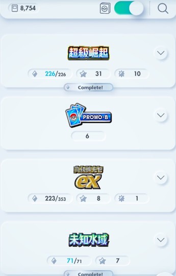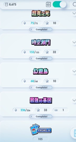 除了ex包外,其它包1星以下都全圖鑑。全部的牌都有,讓您想組什麼牌組都可以組