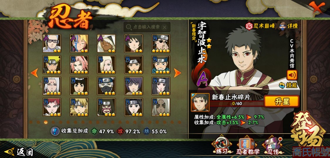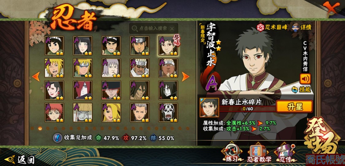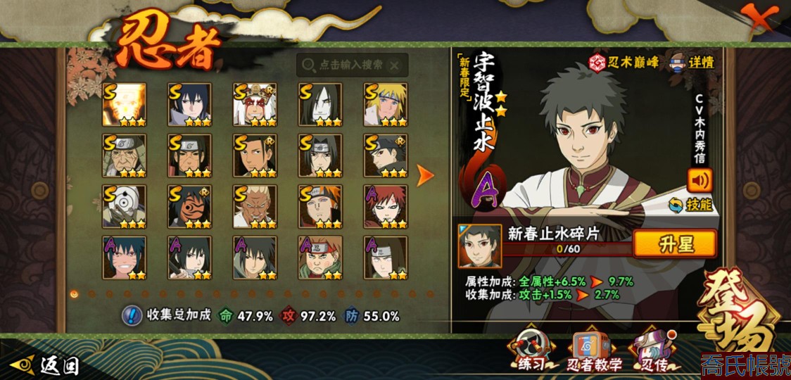 【OBHAWYM199442】戰鬥力:378W+;段位:見習1階;本服排名:1636;戰區排名:未上榜;VIP11級;S忍14個;A忍30個;通靈獸16個;S忍:九喇嘛連結漩渦鳴人,永恆萬花筒宇智波佐助,舞之豪傑自來也,大蛇丸,波風水門,穢土轉生猿飛日斬,穢土轉生千手柱間,木葉創立千手柱間,須佐能乎宇智波鼬,須佐能乎宇智波止水,白面具宇智波斑,紅夜之刃神秘面具男,忍界大戰艾,天道佩恩;A忍:疾風傳我愛羅(3星),忍者之路神秘面具男,須佐能乎宇智波佐助,宇智波泉奈,忍界大戰秋道丁次,忍界大戰日向寧次,忍界大戰李洛克,最終章日向雛田,邁特凱,猿飛阿斯瑪,新春限定宇智波止水,新春限定波風水門,青年波風水門,近松十人衛千代,奇拉比,青年艾,不緣,青年長門,漂泊浪客佩恩六道,穢土轉生角都,曉大蛇丸,蠍,幹柿鬼鮫,穢土轉生迪達拉,飛段,死司憑血飛段,六代目水影長十郎,桃式顯現漩渦博人,五代目雷影達魯伊,四代目土影黑土;通靈獸:忍犬,藍蛇,蛤蟆吉,忍龜,砂之守鶴,鐮鼬,猿魔,山椒魚,蛞蝓,蜃,蛤蟆仙人,鮫鯊,熊貓,蛤蟆健,烏鴉,蛤蟆龍;時裝:百戰佩恩天道,蜀面豪傑舞之豪傑自來也,百戰宇智波鼬須佐能乎,百戰波風水門,百戰大蛇丸,太極靈韻日向花火武當宗師,斑之附身神秘面具男忍者之路,緋櫻綻放春野櫻百豪,傳說的光芒波風水門,龍的傳人李洛克截拳宗師,驚雷掠影達魯伊五代目雷影,熊貓少女天天峨眉宗師,烈火華服宇智波止水新春限定,血霧怪人幹柿鬼鮫;【2113】14s