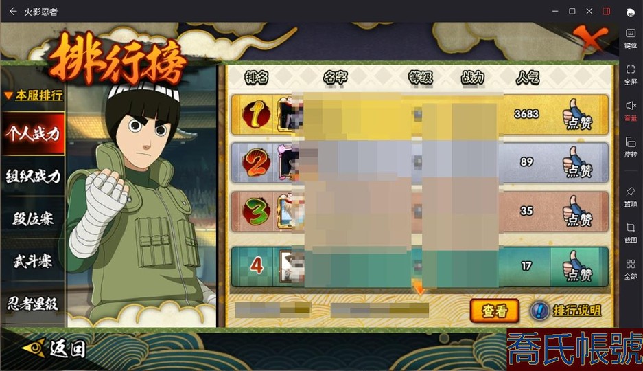 【OBHAWYM787242】VIPV8級;S忍10個;A忍24個;通靈獸16個;S忍:傳說中的三忍自來也,天道佩恩,穢土轉生宇智波鼬,永恆萬花筒宇智波佐助,木葉創立千手柱間,忍界大戰艾,舞之豪傑自來也,須佐能乎宇智波鼬,死門邁特凱,波風水門;A忍:幻之真容旗木卡卡西,漂泊浪客佩恩六道,四代目土影黑土,青年波風水門,近松十人衛千代,須佐能乎宇智波佐助,忍界大戰秋道丁次,萬花筒寫輪眼宇智波佐助,死司憑血飛段,疾風傳我愛羅,桃式顯現漩渦博人,六代目水影長十郎,不緣,五代目雷影達魯伊,不動,緋流琥蠍,宇智波泉奈,迪達拉,飛段,邁特凱,幹柿鬼鮫,蠍,猿飛阿斯瑪,忍界大戰土臺;永久通靈獸:砂之守鶴,藍蛇,蛤蟆吉,忍龜,鐮鼬,山椒魚,蜃,蛤蟆仙人,蛤蟆健,蛤蟆龍,零尾,熊貓,蛞蝓,忍犬,鮫鯊,烏鴉;v8/木創柱間/死凱/死鼬/紫狗/忍戰艾/三自/1直購a/熊貓