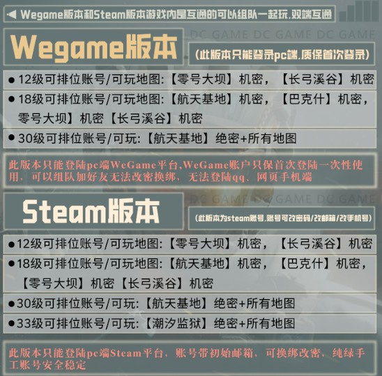 | Steam 登錄 | 30 級 | 1000 萬幣 | 可改密換綁 |