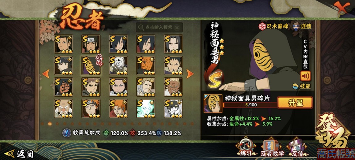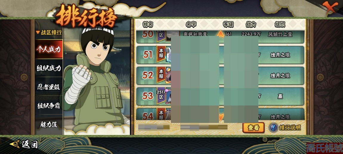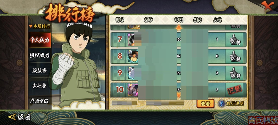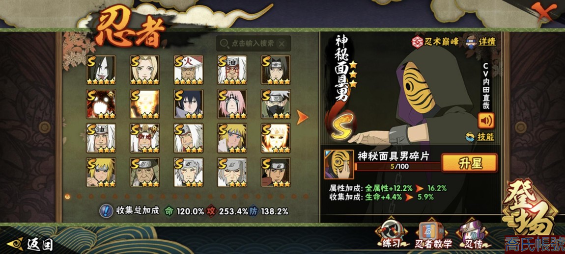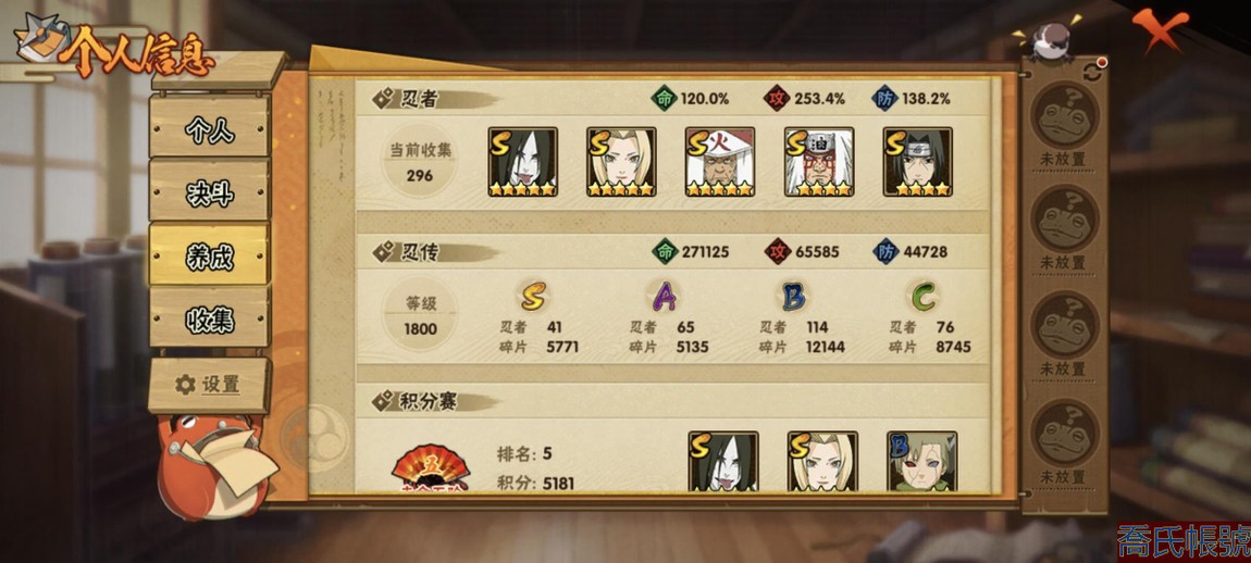 【11等】戰鬥力:2240萬;VIPV15級;S忍4個;A忍4個;通靈獸3個;S忍:五