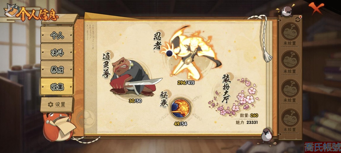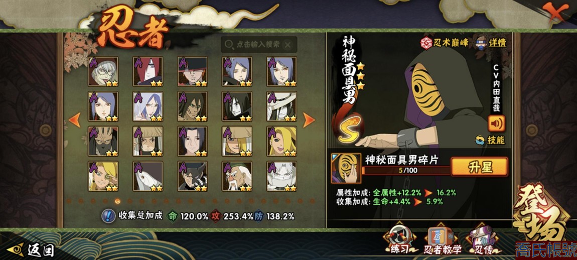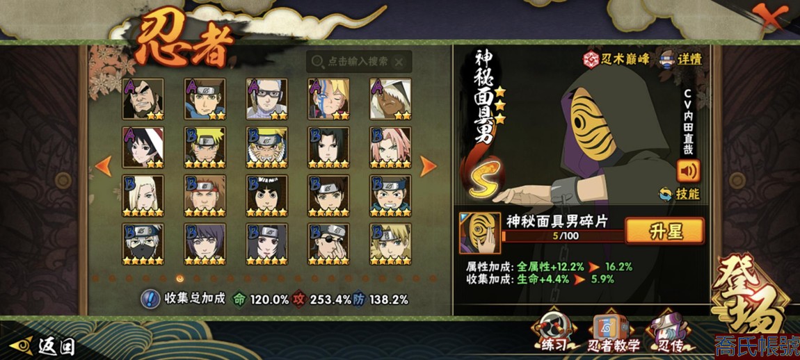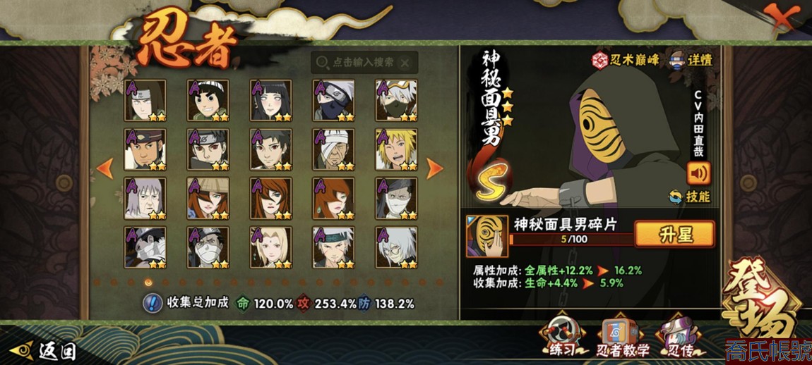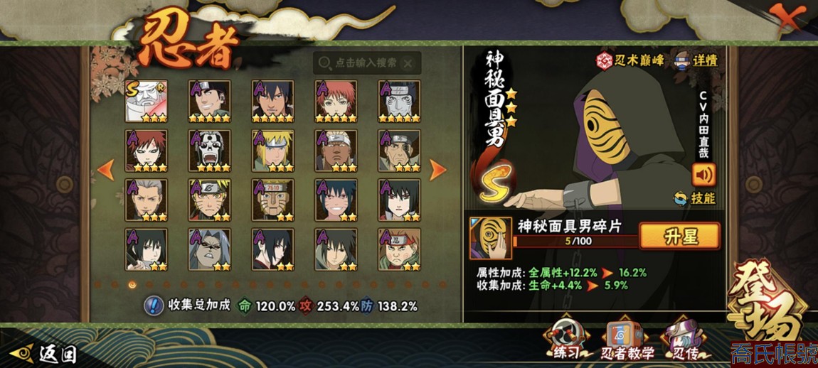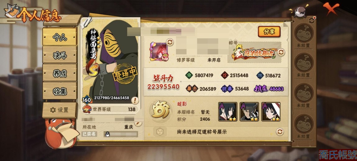 【11等】戰鬥力:2240萬;VIPV15級;S忍4個;A忍4個;通靈獸3個;S忍:五
