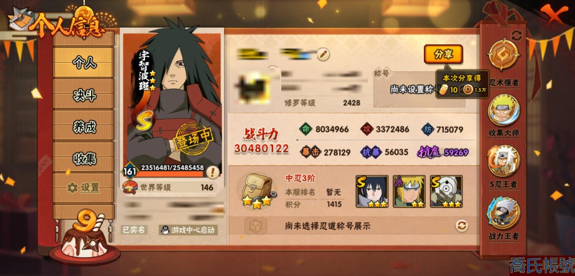 【11等】戰鬥力:3048W+;段位:中忍3階;本服排名:21;戰區排名:未上榜;VI