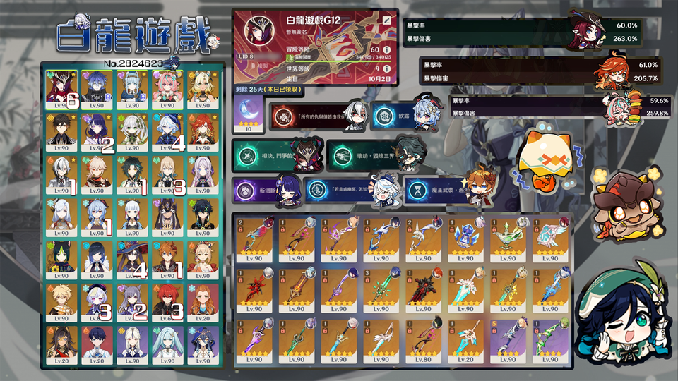 【男、60等、60金角、26金武】G12_恰斯卡6+2僕人1+1水神4+1菲林斯火神伊涅芙茜特希諾寧草神萬葉葉蘭