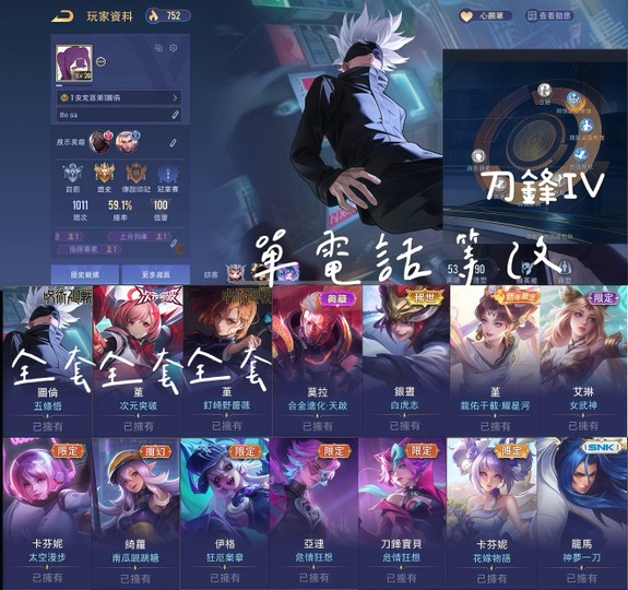 【Garena帳有綁定、先鋒傳說·新月、V8、53英、94造】稀有綁好單電話等改 次元菫、五條全套、合金典藏、末世龍焰IV、白虎