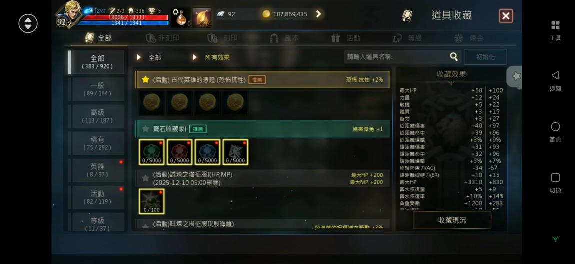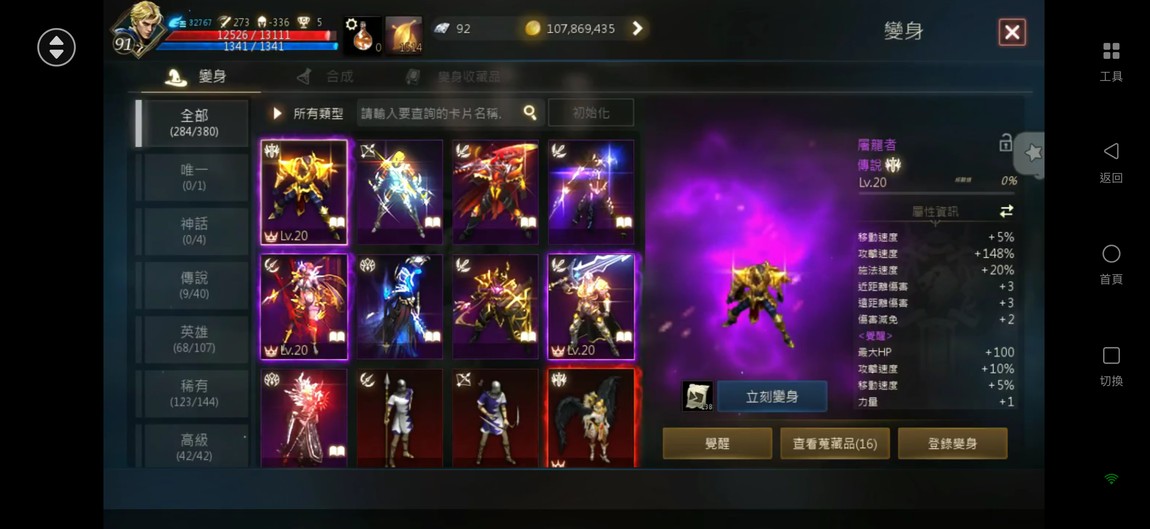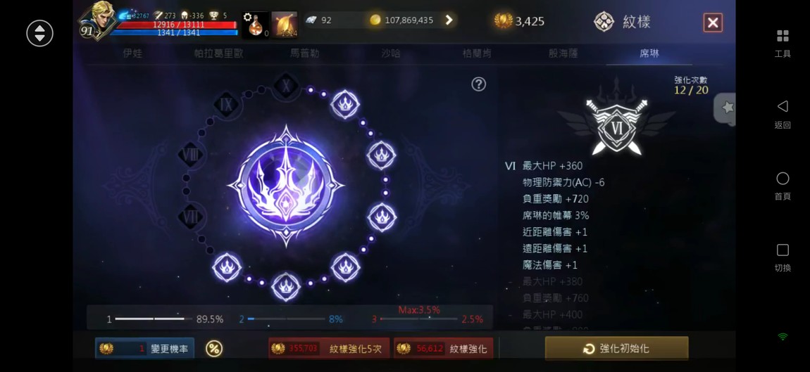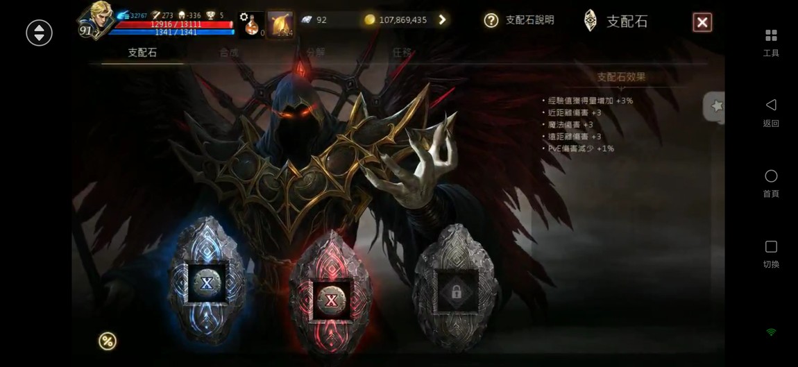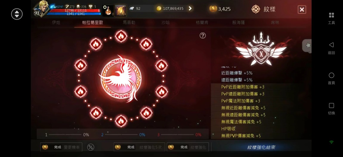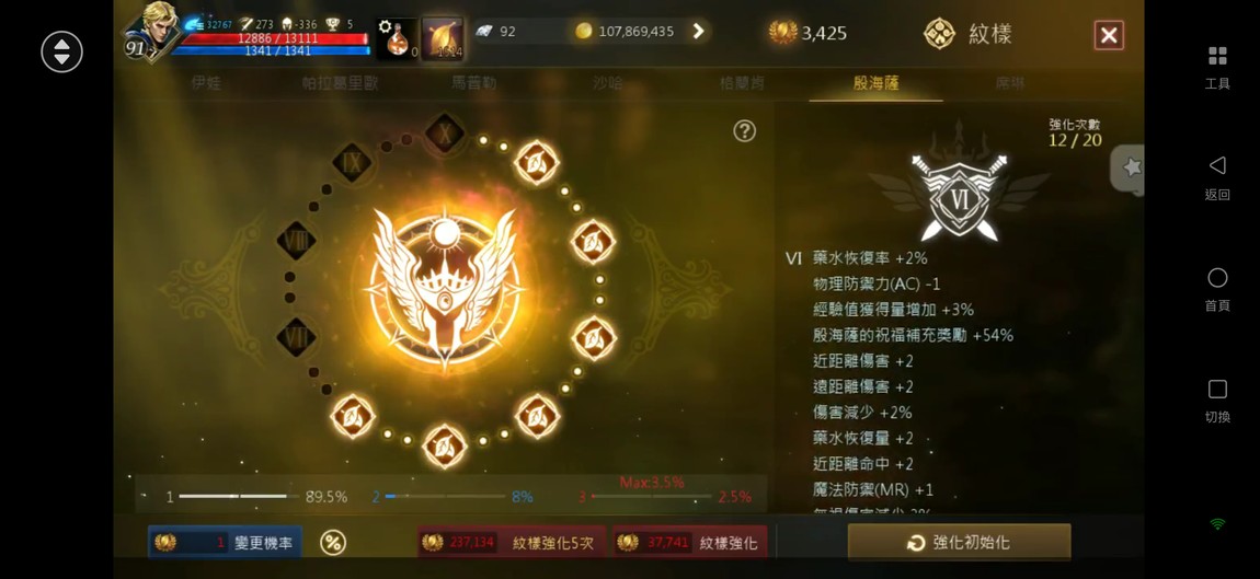 【天堂M】 91.6%、2金、金技【諸神/風暴】、商/特【一閃/極限】、3圈、攻近300、抗暈近100%、+6英雄力T、刻印+5地龍甲、+7火晶、雷神EP.3854