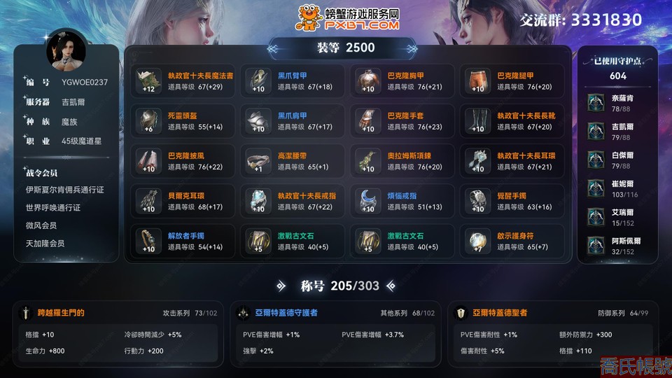 【OBYGWOE023742】【吉凱爾】45級魔族女魔道星,裝等2500,守護力604,支線進度全滿,封印副本全種族進度全滿,羽毛進度滿級,戰令會員:伊斯夏爾肯傭兵通行證,世界呼喚通行證,微風會員,天加隆會員,稱號:跨越羅生門的,亞爾特蓋德守護者,亞爾特蓋德聖者,時裝:雪花透膚裝;翅膀:森林精靈翅膀;主力技能全16級,一張金卡