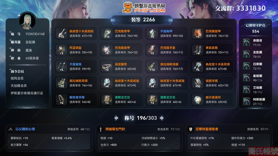 【11等】45級魔族女殺星,裝等2266,守護力554,支線進度全滿,封印副本本種族進度全