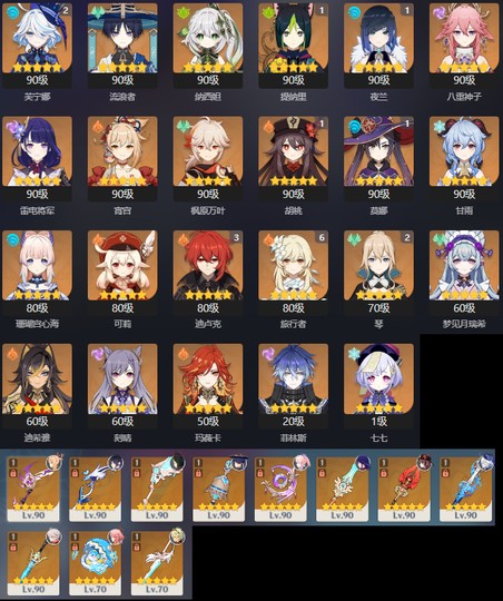 【女、60等、23金角、11金武】46金_C2水神專_C1胡桃專_C1夜蘭專_火神_菲林斯_已畢業_可議價