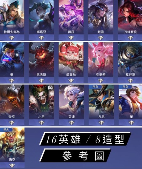 凡恩、娜塔亞、薇拉、趙雲、馬洛斯、悟空、夸克、亞連、刀鋒寶貝、勇、愛麗絲、堇、克里希、莫托斯、特爾安娜絲、小丑