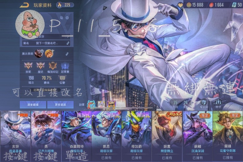 【Garena帳無綁無連、星耀、無VIP、36英、26造】亥犽基德 勇柯南都只有按鍵 森圖單造