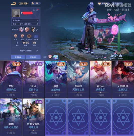 【Garena帳無綁無連、青銅、無VIP、7英、8造】無無100%勝率 亥犽銀翼 令月星神