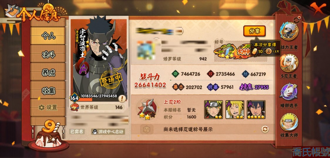 【11等】戰鬥力:2664W+;段位:上忍2階;本服排名:28;戰區排名:未上榜;VIP