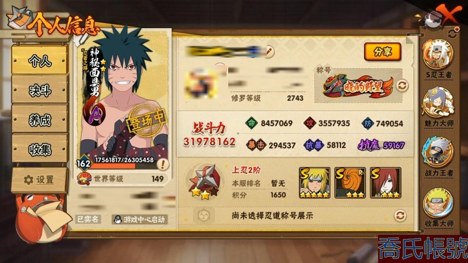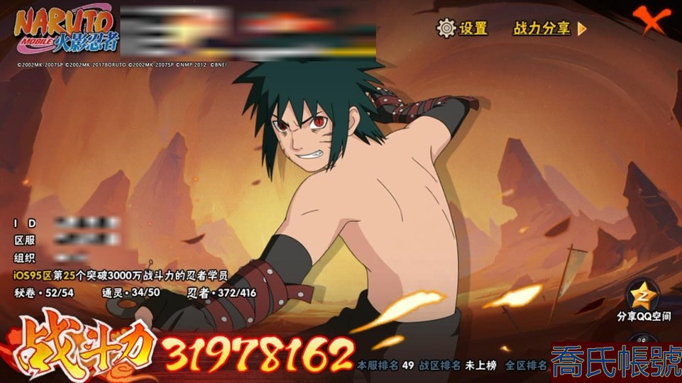 【11等】(備註:三連體號火影王者lol)戰鬥力:3197W+;段位:上忍2階;本服排名