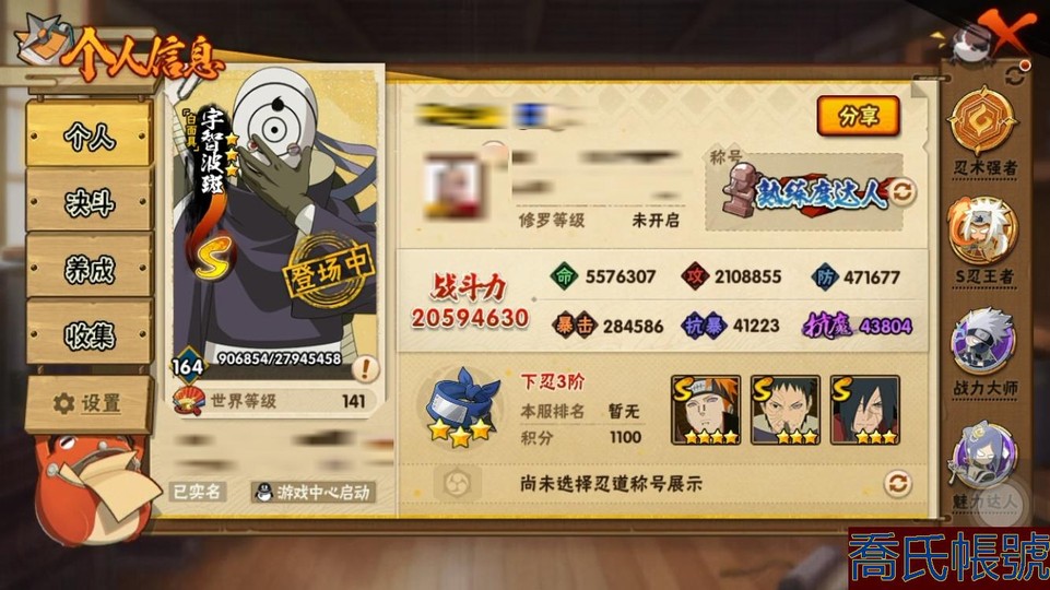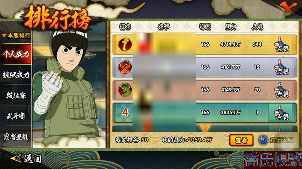 【11等】戰鬥力:2059W+;段位:下忍3階;本服排名:50;戰區排名:未上榜;VIP