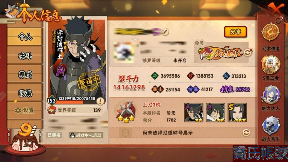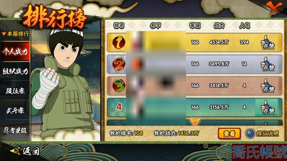 【11等】戰鬥力:1416W+;段位:上忍3階;本服排名:108;戰區排名:未上榜;VI