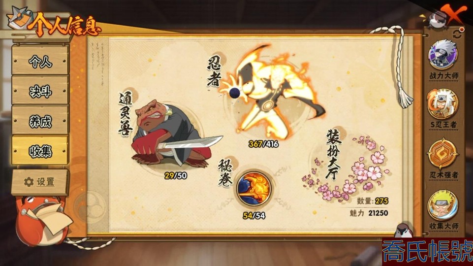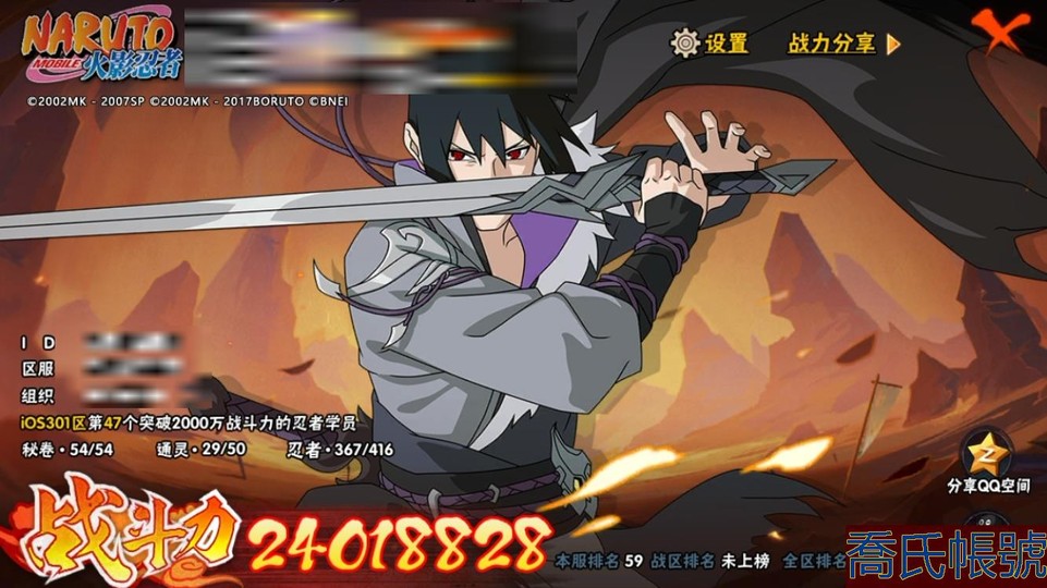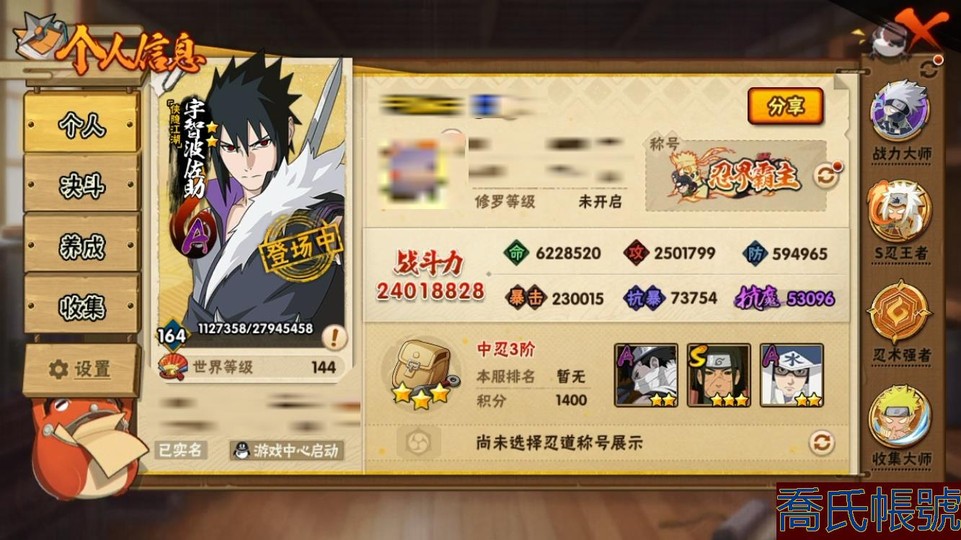 【11等】戰鬥力:2401W+;段位:中忍3階;本服排名:59;戰區排名:未上榜;VIP