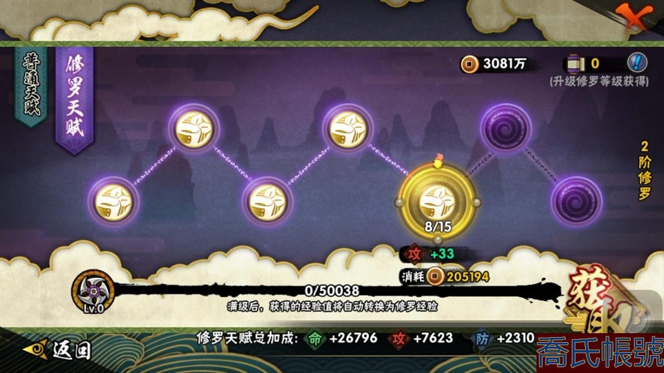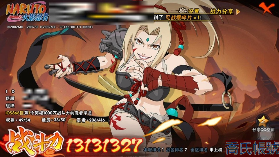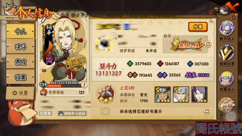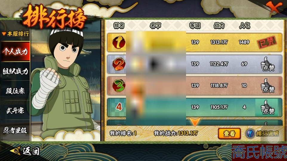 【11等】戰鬥力:1313W+;段位:上忍3階;本服排名:1;戰區排名:7 ;VIP15