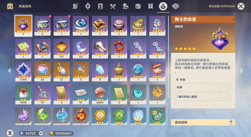 ✦ 無主的命星(突破100道具)有7個
