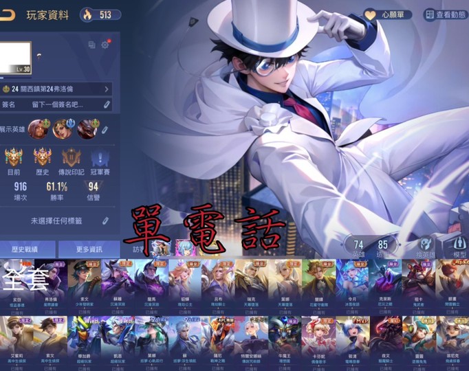 【Garena帳無綁無連、璀璨傳說、V6、74英、85造】單電話 歷史璀璨 積德 星際 發明家 深淵 光幕 冰雪 騎士 花蜜 2傳說