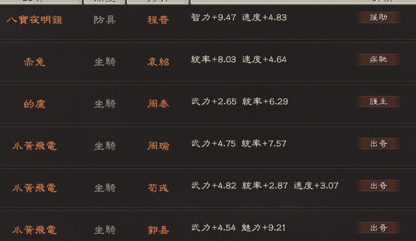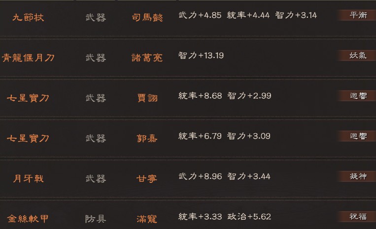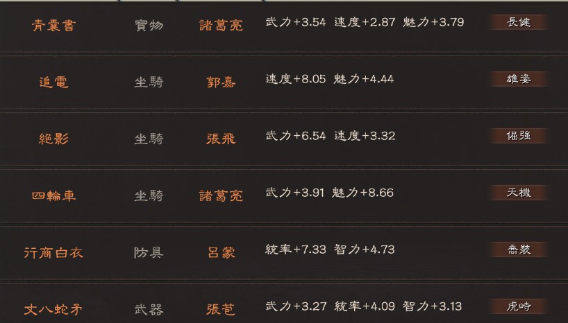 主打典藏滿紅滿特技北伐槍(天機 神算 龍湘 虎峙都有 以及7件雙特技)3匹出奇馬搭配三幻神的富貴騎 10張將作殘卷 寶物方面:2剛體 暴躁 長健 防具:荊棘+精神 4精神 6靈動 2援助 喬裝 灼烈 沉重 坐騎:忠誠+踩踏 3踩踏 3出奇 疾馳 2雄姿 護主 倔強 武器:蠻力+凝神 石膚+符咒 符咒+石膚 平衡+妖氣 2迴響 雄烈 神算 龍湘 虎峙 號令