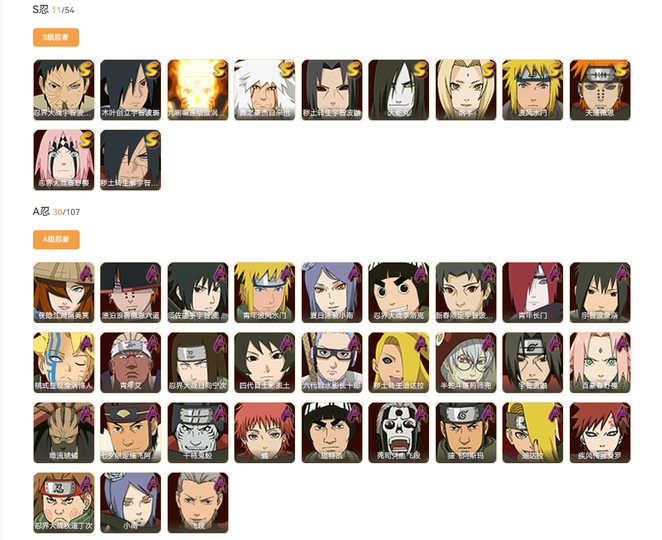 S忍:木叶创立宇智波斑,纲手(普通),忍界大战宇智波带土,舞之豪杰自来也,秽土转生宇智波鼬,秽土转生解宇智波斑,波风水门(普通),天道佩恩,大蛇丸(普通),忍界大战春野樱,九喇嘛连结漩涡鸣人;