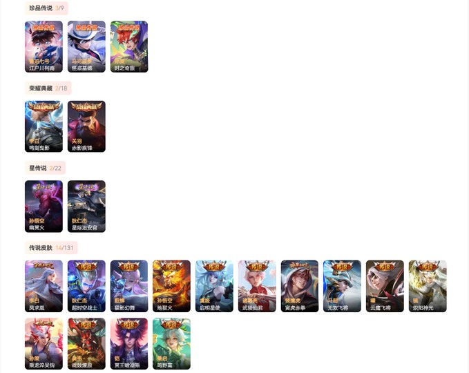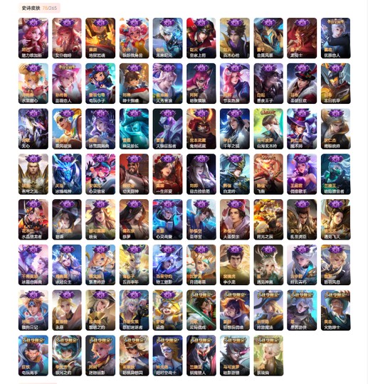 【史诗皮肤78】 兰陵王暗隐猎兽者 孙膑茶境仙 阿轲节奏热浪 沈梦溪月团寄思 雅典娜冰冠公主 程咬金功夫厨神 项羽苍穹之光 嬴政优雅恋人 亚瑟心灵战警 伽罗箭羽风息 瑶遇见神鹿 暃星界游侠 马可波罗山海玄木吟 娜可露露晚萤 安琪拉心灵骇客 妲己女仆咖啡 梦奇顽趣 元歌无心 孙策猫狗日记 钟无艳超时空战士 鬼谷子五谷丰年 白起星夜王子 孙尚香蔷薇恋人 阿轲暗夜猫娘 廉颇地狱岩魂 狂铁电玩高手 百里守约特工魅影 高渐离天秀音浪 鲁班七号电玩小子 明世隐吟游魔法 宫本武藏鬼剑武藏 吕布末日机甲 不知火舞魅语 花木兰水晶猎龙者 黄忠火炮绅士 赵云百木心枪 夏洛特永昼 甄姬冰雪圆舞曲 刘禅绅士熊喵 墨子金属风暴 雅典娜黎明之约 米莱狄胡桃异想国 小乔缤纷独角兽 吕布圣诞狂欢 张飞乱世虎臣 干将莫邪冰霜恋舞曲 元歌云间偶戏 橘右京修罗 蒙犽狂想玩偶喵 云中君纤云弄巧 裴擒虎李小龙 百里玄策原初追逐者 马可波罗暗影游猎 墨子龙骑士 阿轲迷踪丽影 赵云未来纪元 李元芳银河之约 韩信飞衡 后羿辉光之辰 曹操天狼征服者 李白千年之狐 兰陵王驯魔猎人 蔡文姬繁星吟游 夏侯惇乘风破浪 刘邦德古拉伯爵 狄仁杰鹰眼统帅 孙尚香水果甜心 露娜一生所爱 孙悟空大圣娶亲 杨玉环遇见飞天 关羽冰锋战神 曹操幽灵船长 狄仁杰魔术师 韩信白龙吟 赵云皇家上将 孙悟空至尊宝 王昭君偶像歌手 妲己魅力维加斯