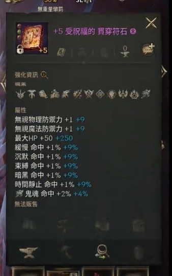 攻速3%、近傷+79、近命+105、力量+30、物防+145、無視物理防禦力+35、無視近迴+14、傷害減免+51、PVP近傷+35、PVP近命+28、PVP傷害減免+30、無視PVP物防+7