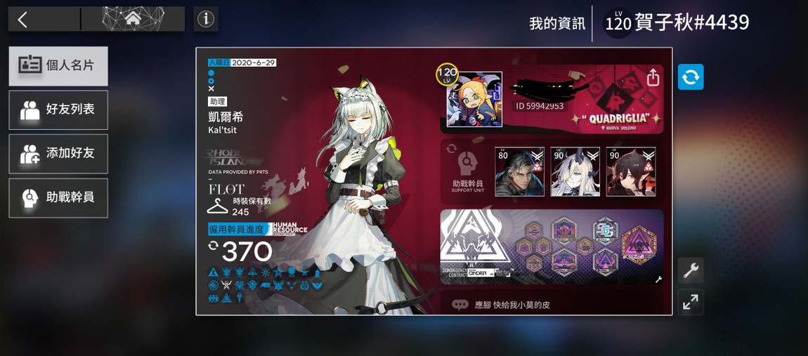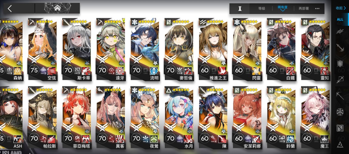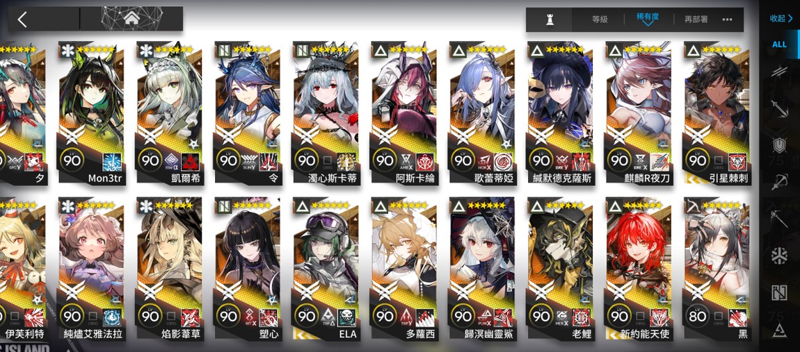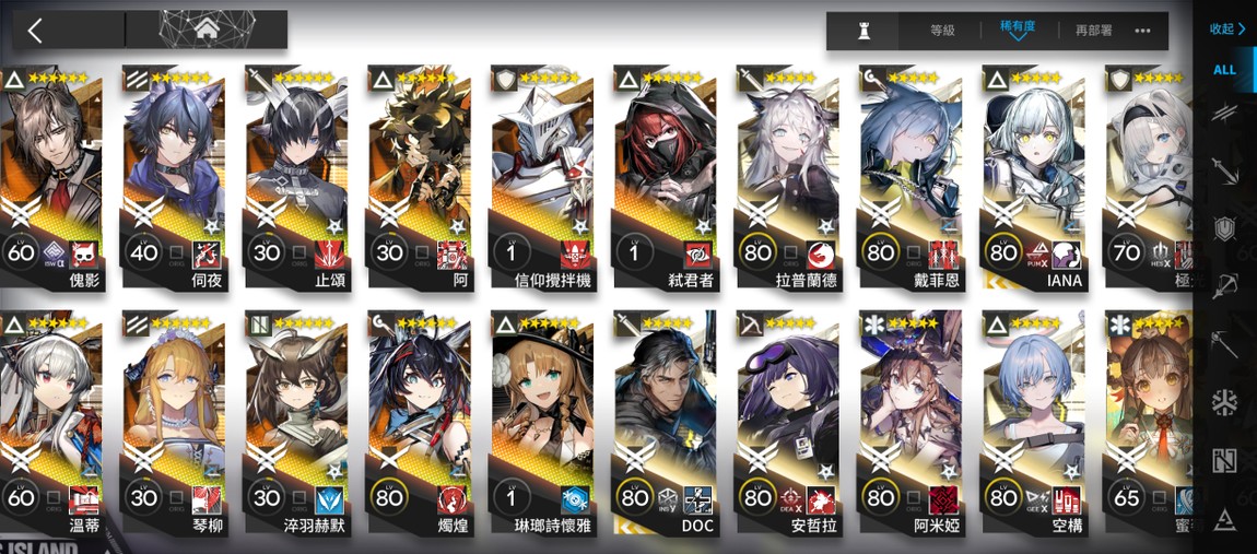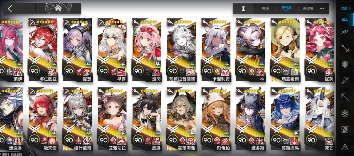 開服老號~全限定全聯動全幹員-1,只缺目前卡池的一般角的輪椅妹雷繆安~不爽抽了~這池比較非洲阿~角色六星只有4隻還沒精二~而且至少都有一技專三~~詳細看圖~讓你六星不在只是花瓶都有機會上場~基建輕鬆日領好幾萬~月卡還有50多天~黃票還有800多張!!~買到賺到~~還不少石頭可以挖~~資源豐富材料滿滿~~<裡面還有一張更名卡