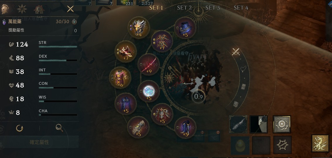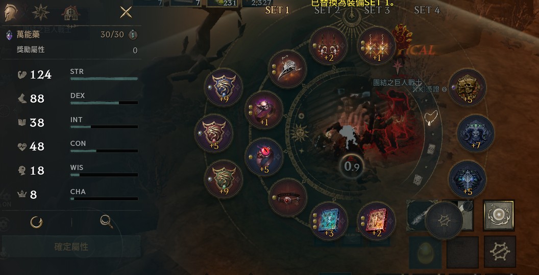 +9殺戮鬼劍+5妖氣寶珠+5力量脛甲 +5暗殺鞋 +6水面 +7燦爛力量肩甲 +6燦爛鬥士T +1受祝福裂痕耳環 +2怨恨耳環 +3受祝福忍耐符石(防+防+1防+1) +2貫穿符石(防+1防+1) +4燦爛力量 非刻印 +1受祝福變怪戒 +5暗殺頭 +5暗殺斗篷 +5克特手套 祝福不死項鍊 力量皮帶 紫守護+9 紅智慧+9 紫勇猛+5 收藏23.08