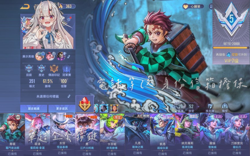 【Garena帳有綁定、鑽石、V6、29英、52造】炭治郎 蜜莉姆 基德 柯南