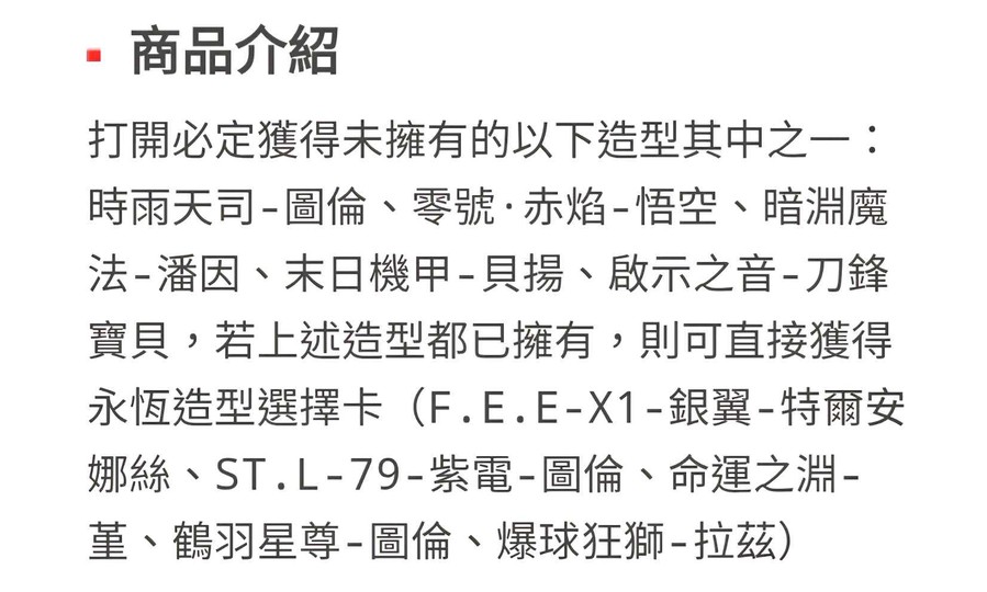 打開必定獲得未擁有的以下造型其中之一:時雨天司-圖倫、零號·赤焰-悟空、暗淵魔法-潘因、末日機甲-貝揚、啟示之音-刀鋒寶貝,若上述造型都已擁有,則可直接獲得永恆造型選擇卡(F.E.E-X1-銀翼-特爾安娜絲、ST.L-79-紫電-圖倫、命運之淵-堇、鶴羽星尊-圖倫、爆球狂獅-拉茲)